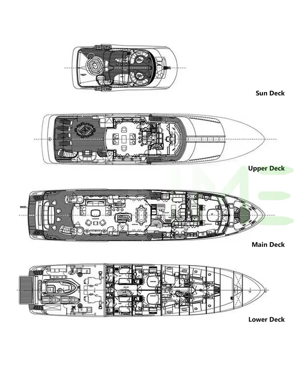Request plans that include the layout of staterooms, guest areas, and outdoor spaces, as well as crew quarters and work areas.