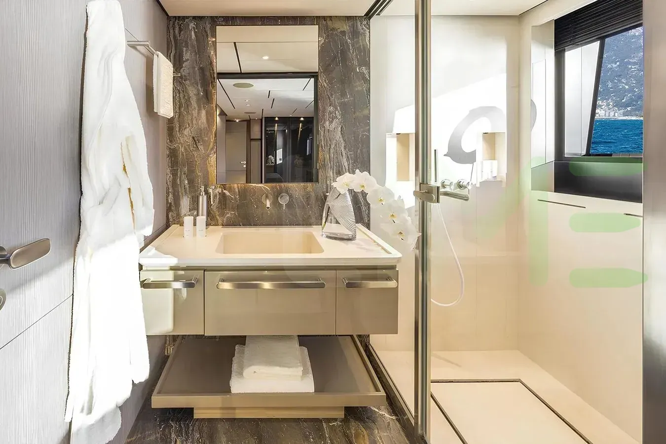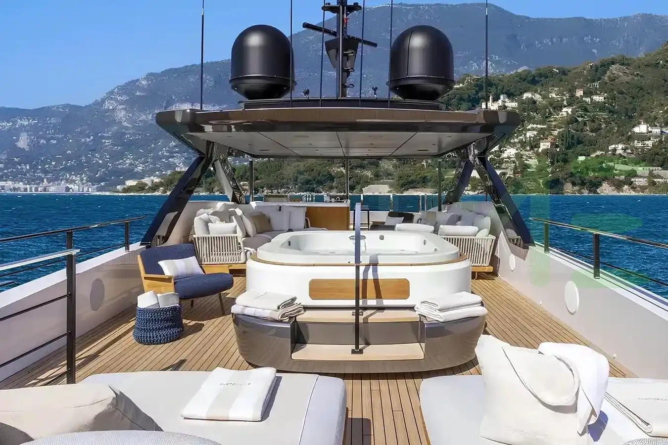 Her features include underwater lights, deck jacuzzi, WiFi and air conditioning.