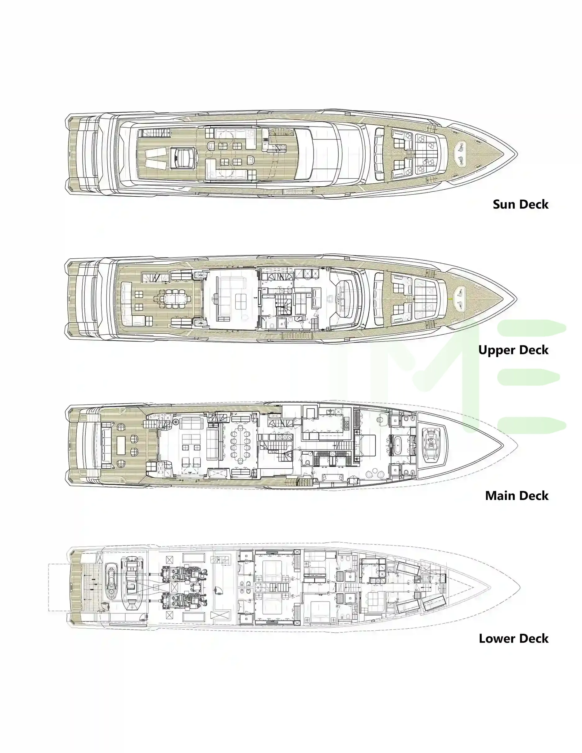 Request plans that include the layout of staterooms, guest areas, and outdoor spaces, as well as crew quarters and work areas.