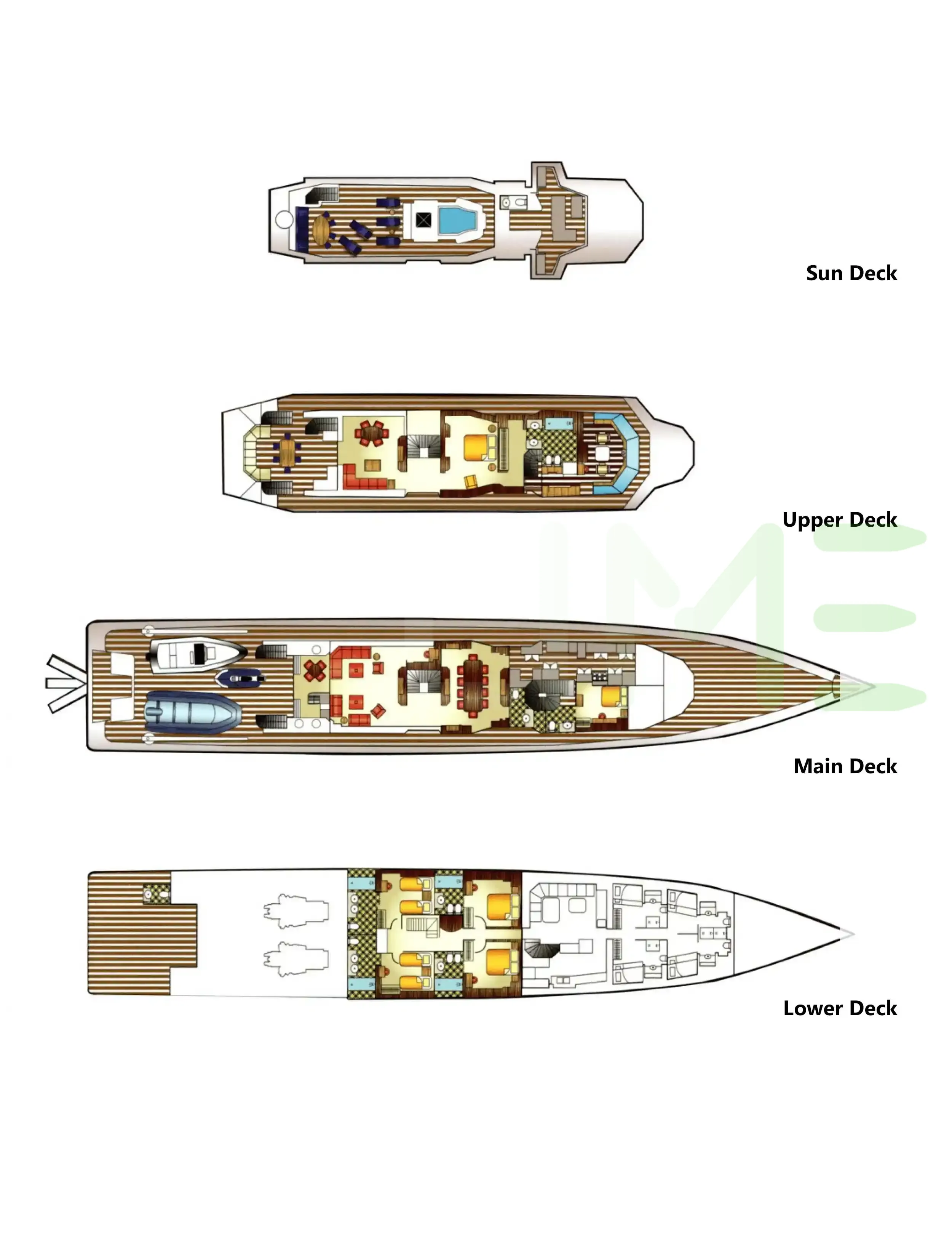 Request plans that include the layout of staterooms, guest areas, and outdoor spaces, as well as crew quarters and work areas.