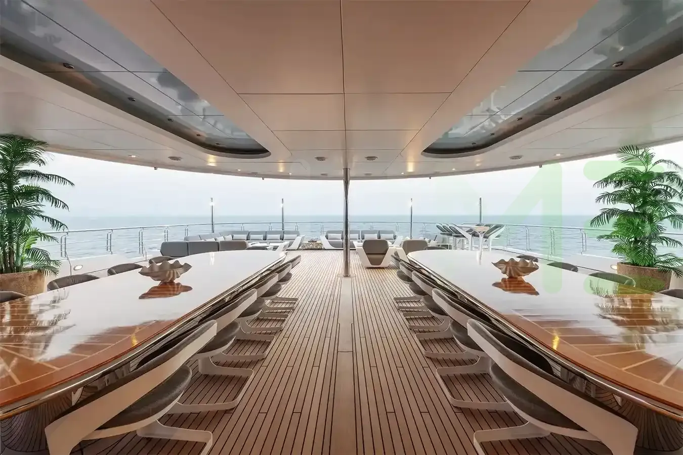Enhanced by her steel full-displacement hull, and aluminium superstructure, a higher level of seaworthiness and comfort for those on board the MOONLIGHT II yacht has been achieved. The visual appeal of the exterior is complimented by the rich color and distinctive grain patterns of teak decks that lend an air of sophistication to the yacht's appearance.