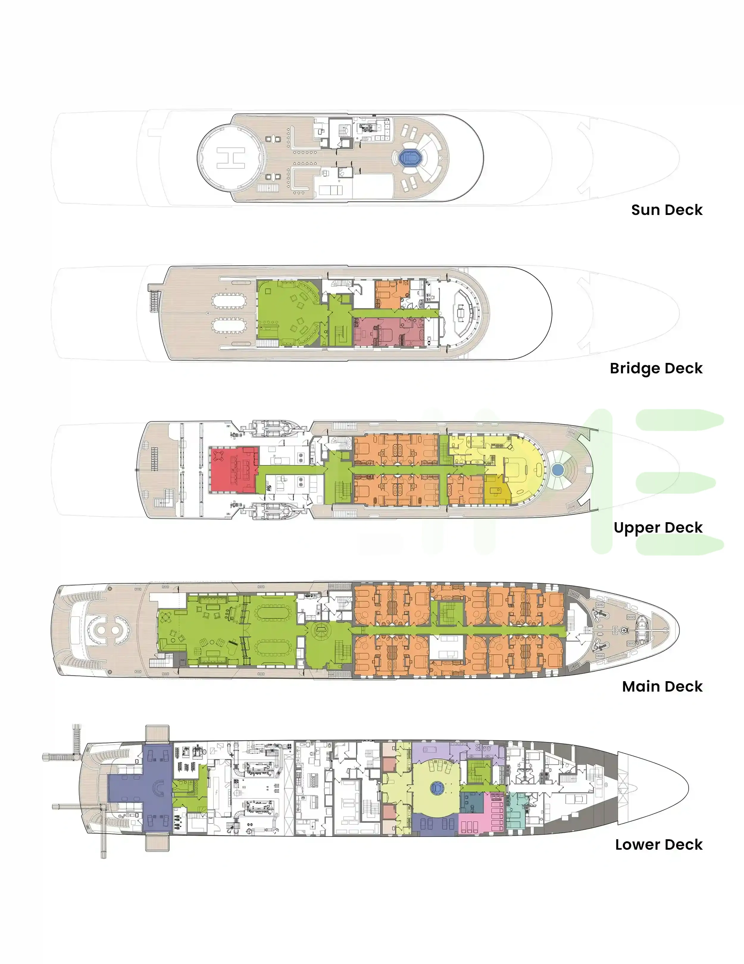 Request plans that include the layout of staterooms, guest areas, and outdoor spaces, as well as crew quarters and work areas.