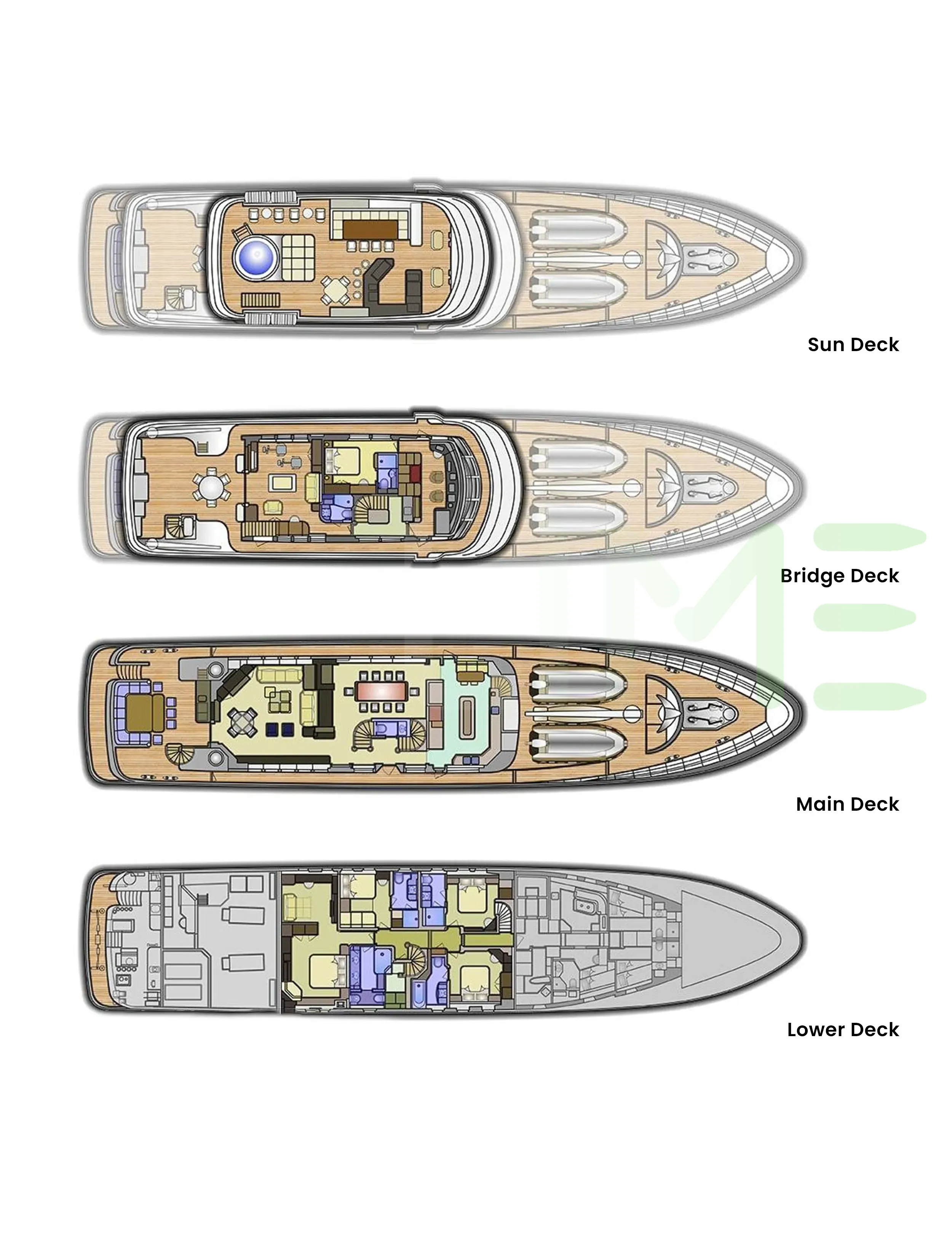 Request plans that include the layout of staterooms, guest areas, and outdoor spaces, as well as crew quarters and work areas.