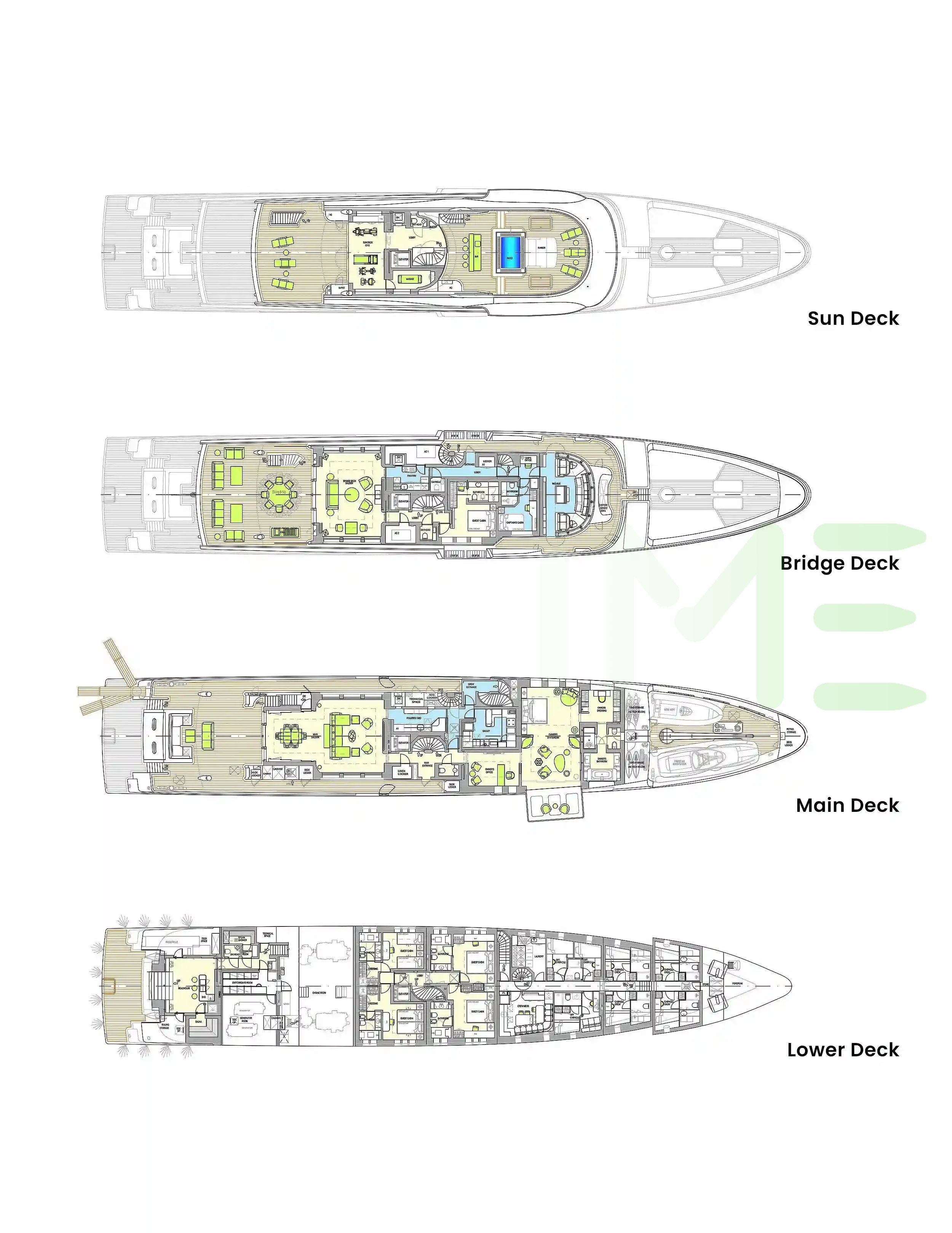 Request plans which include the layout of staterooms, guest areas, and outdoor spaces, as well as crew quarters and working spaces.