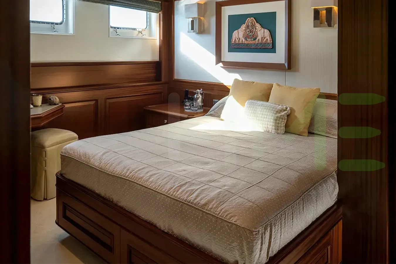 MY LITTLE VIOLET is a full-displacement oceangoing mono-hull motoryacht, with a beam of 28' 7" (8.7 meters), offering stability and comfort during blue water open ocean navigation, including near coastal and inland cruising. Her full-displacement hull shape and draft of 9' 2" (2.8 meters) further contribute to a yacht with a longer range, stowage, and a smooth sailing experience, making her ideal for extended journeys and global travel.