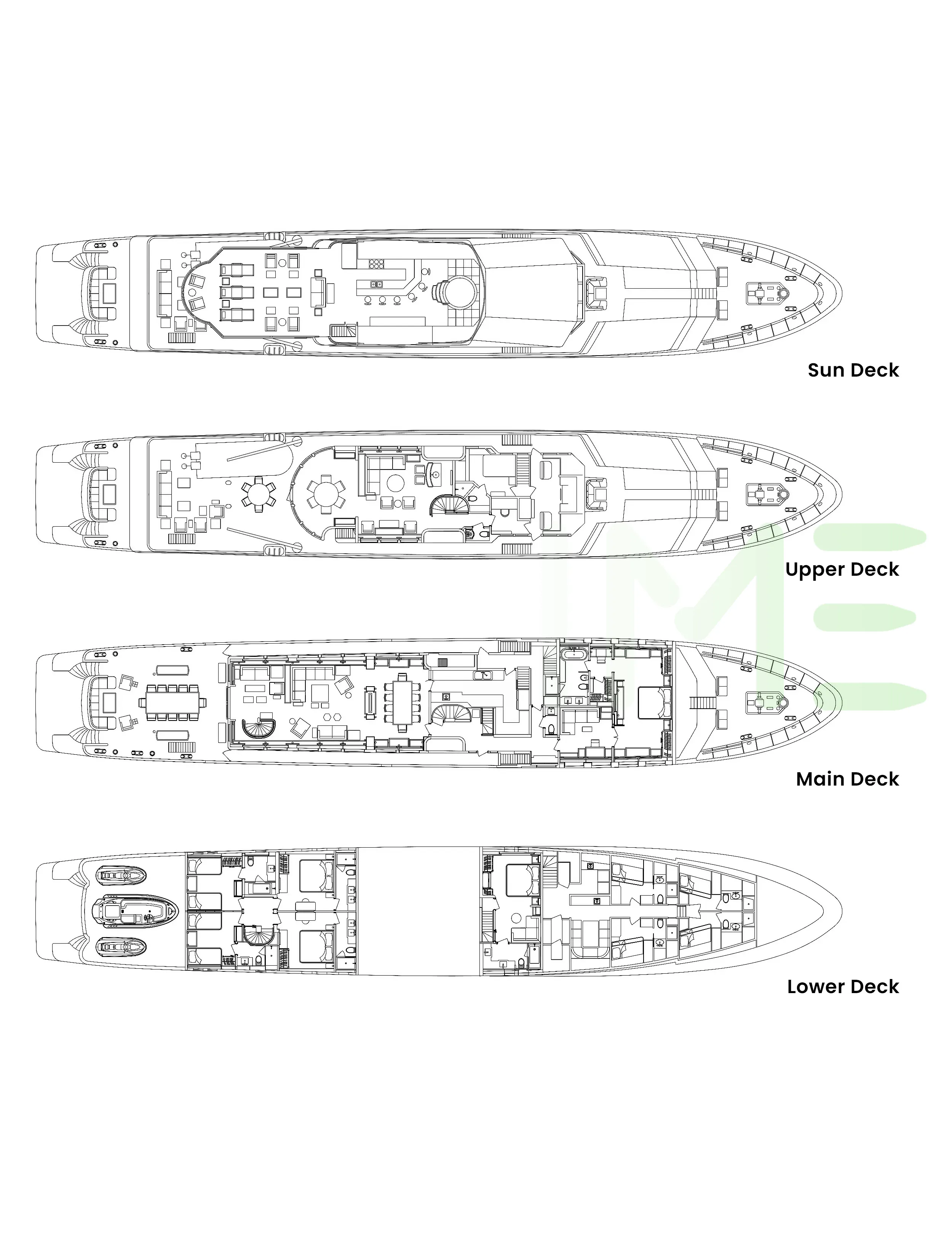Request plans that include the layout of staterooms, guest areas, and outdoor spaces, as well as crew quarters and work areas.