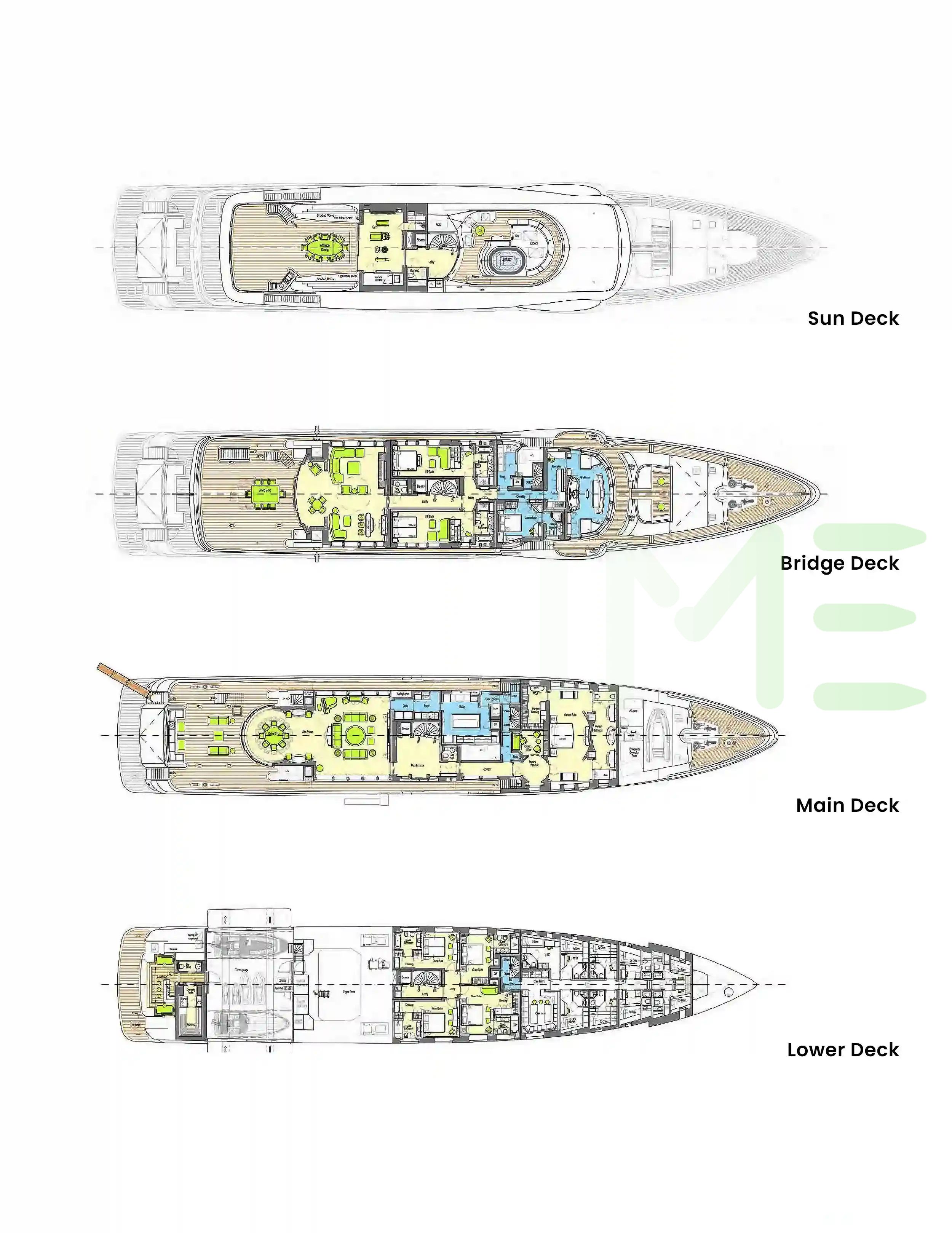 Request plans that include the layout of staterooms, guest areas, and outdoor spaces, as well as crew quarters and work areas.