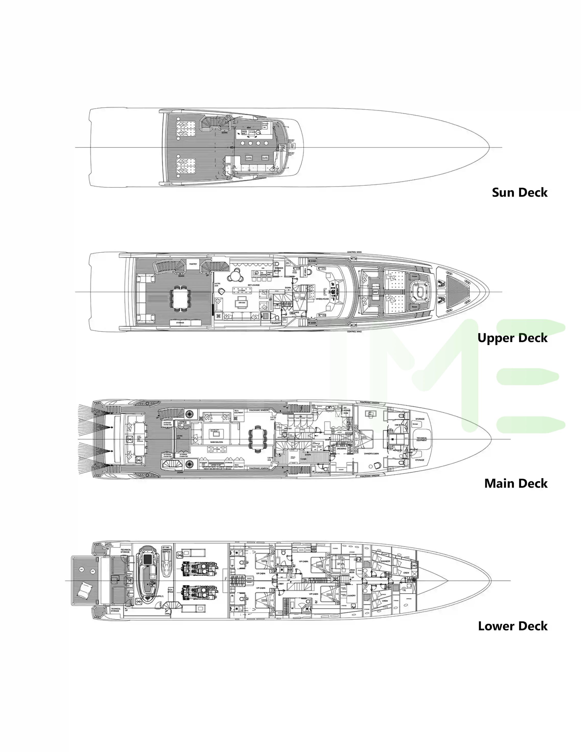 Request plans that include the layout of staterooms, guest areas, and outdoor spaces, as well as crew quarters and work areas.