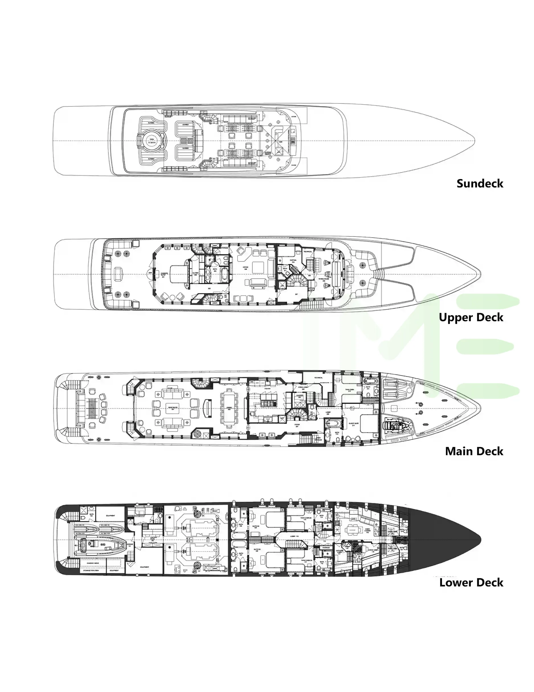 Request plans that include the layout of staterooms, guest areas, and outdoor spaces, as well as crew quarters and work areas.