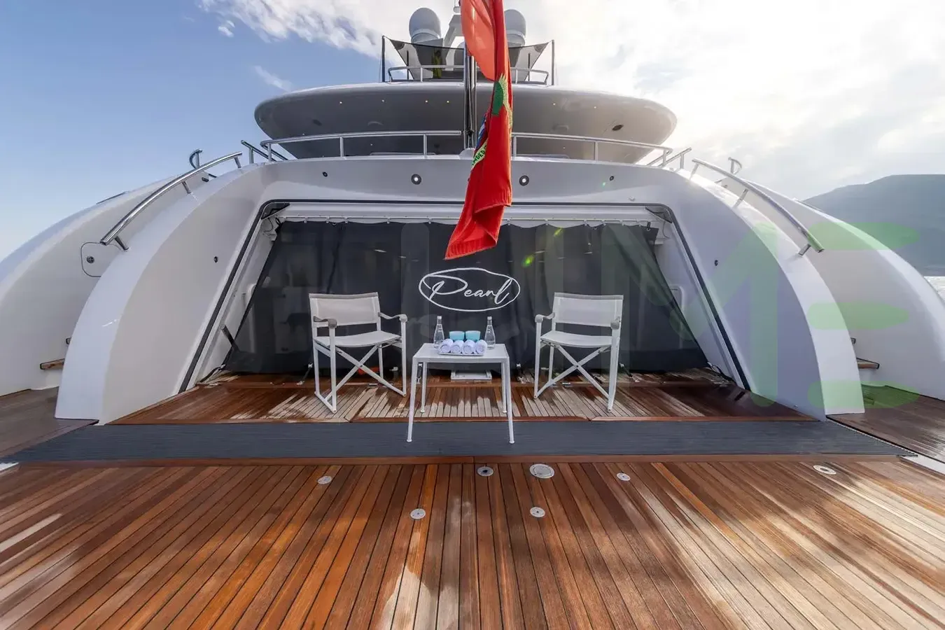 Enhanced by her steel full-displacement hull, and aluminium superstructure, a higher level of seaworthiness and comfort for those on board the PEARL yacht has been achieved. The visual appeal of the exterior is complimented by the rich color and distinctive grain patterns of teak decks that lend an air of sophistication to the yacht's appearance.