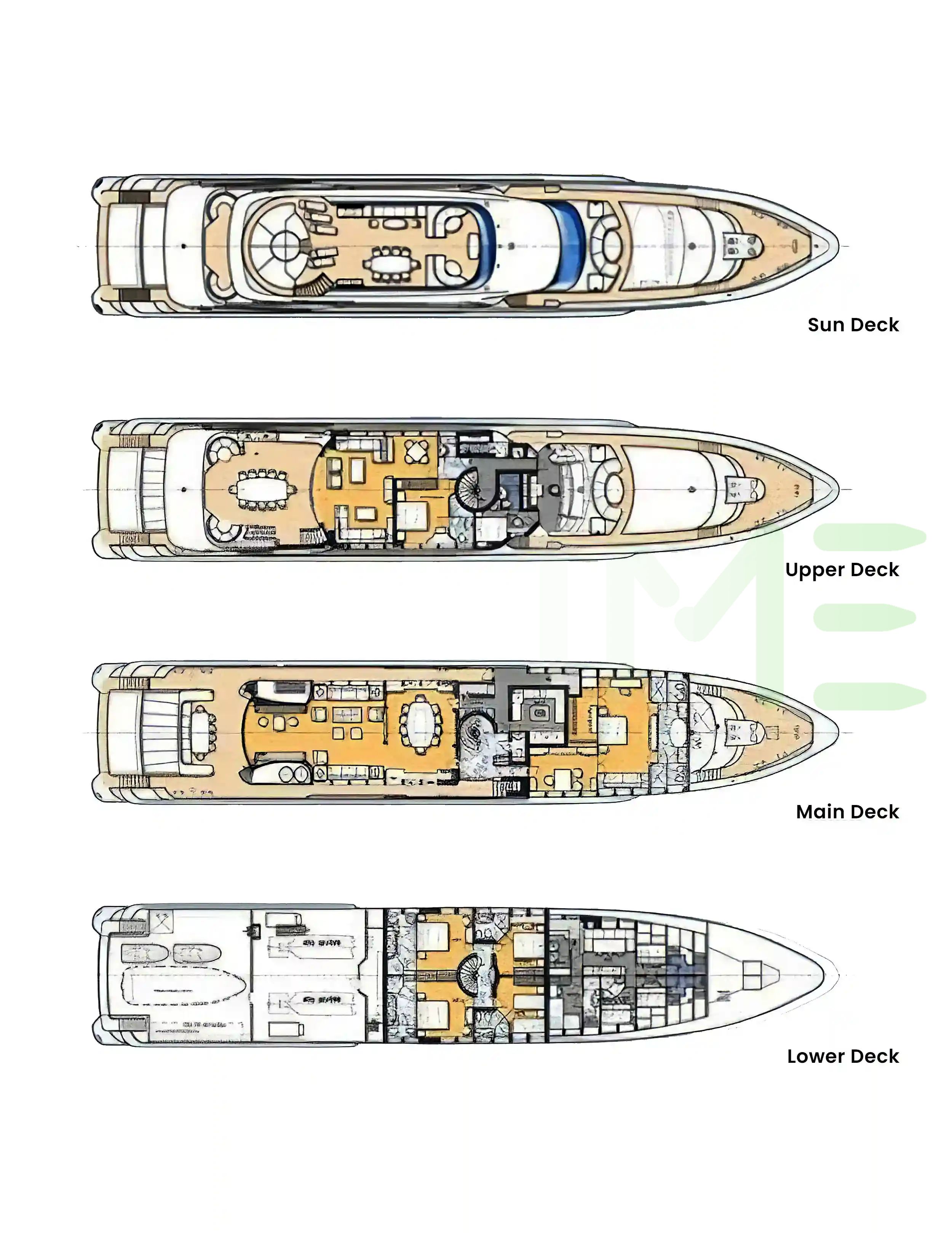 Request plans that include the layout of staterooms, guest areas, and outdoor spaces, as well as crew quarters and work areas.