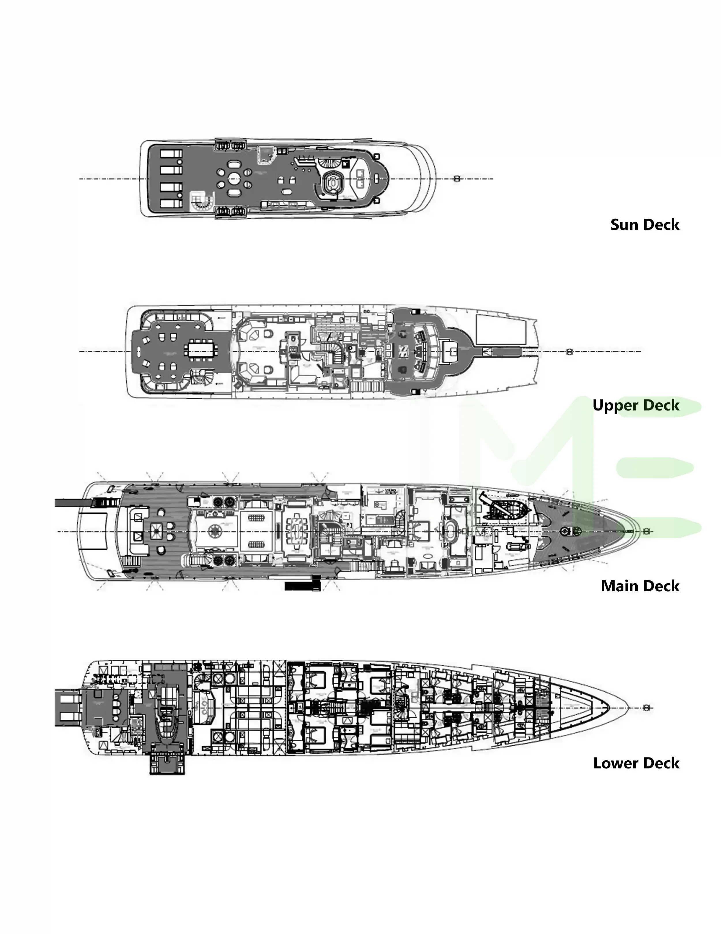 Request plans that include the layout of staterooms, guest areas, and outdoor spaces, as well as crew quarters and work areas.