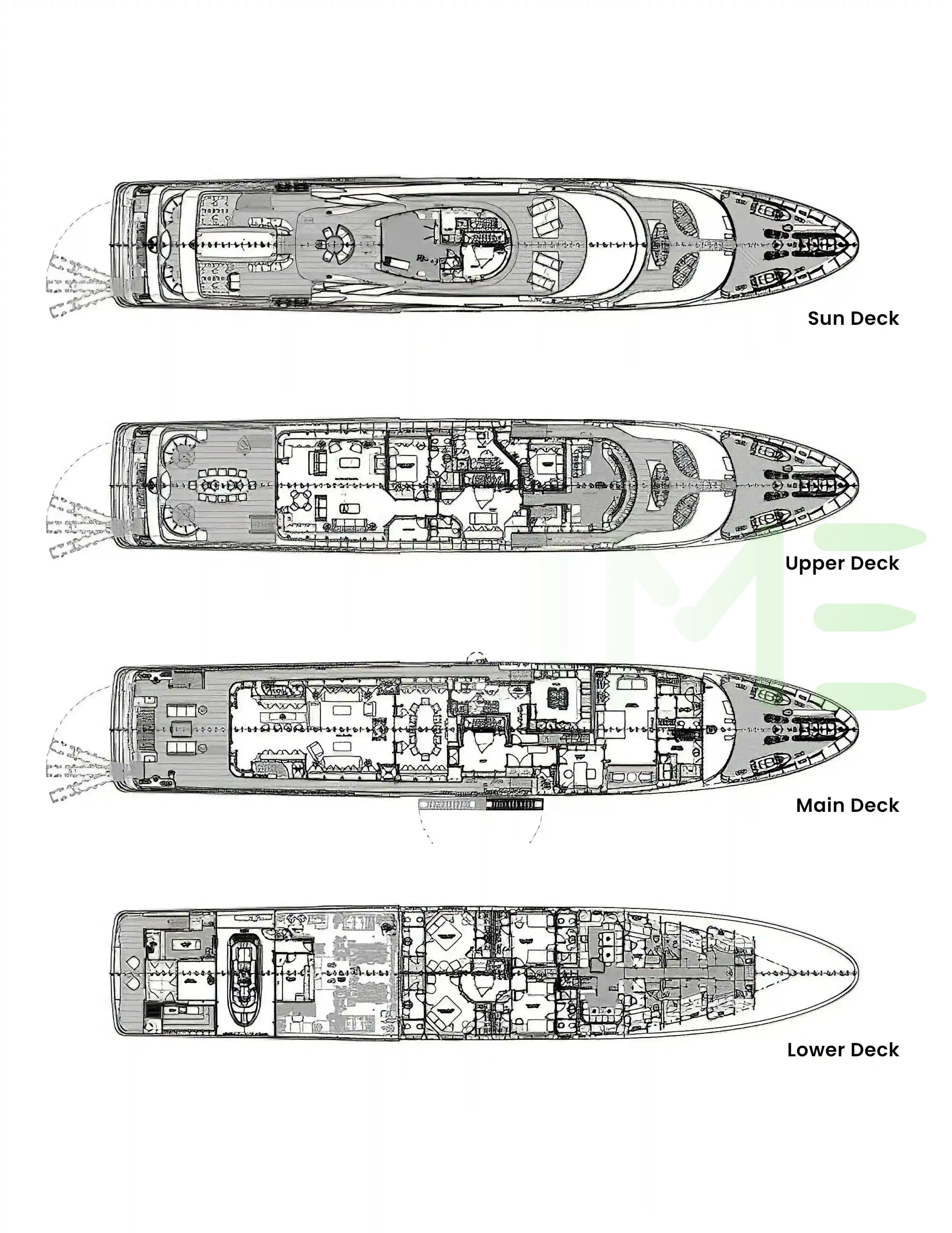 Request plans that include the layout of staterooms, guest areas, and outdoor spaces, as well as crew quarters and work areas.