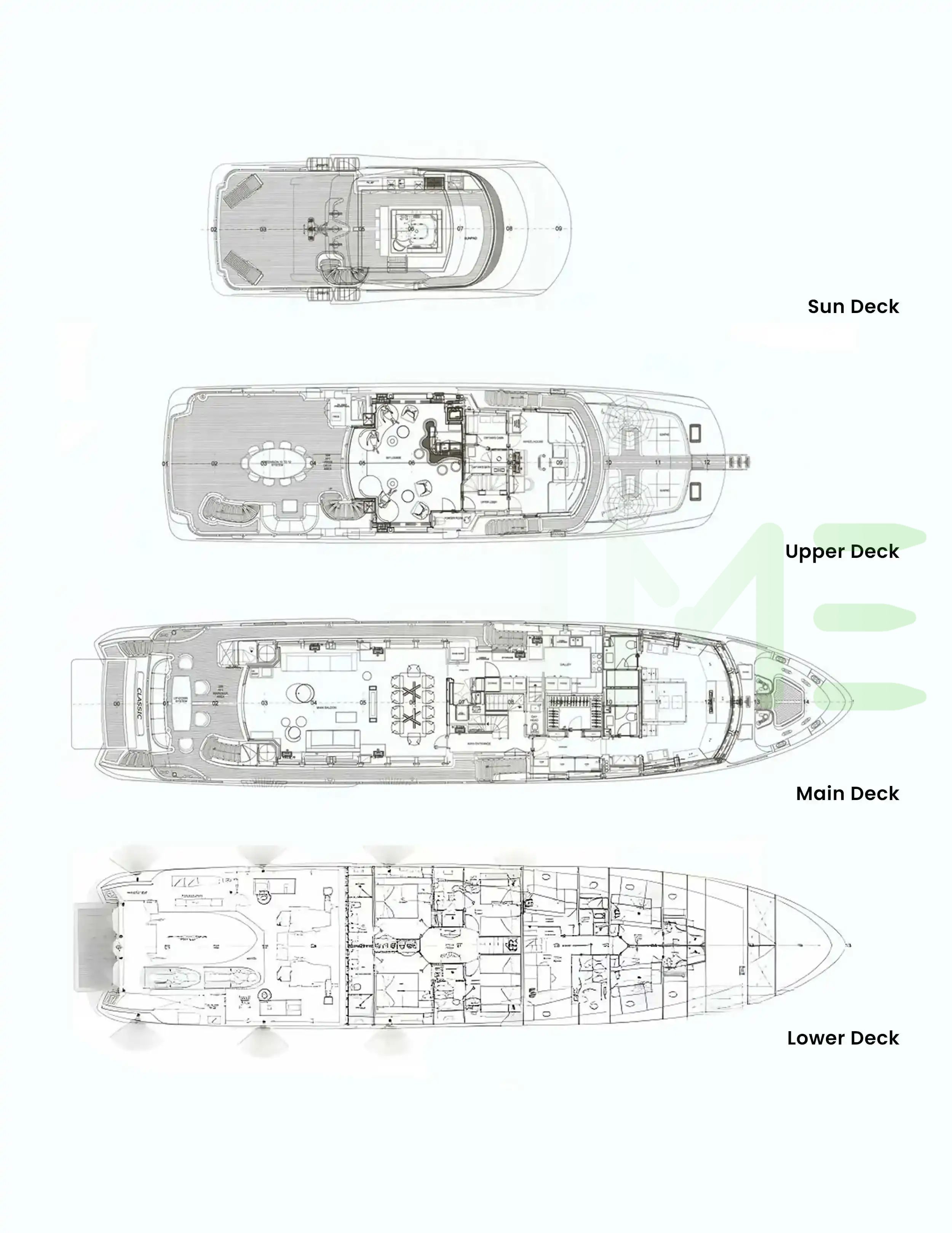 Request plans that include the layout of staterooms, guest areas, and outdoor spaces, as well as crew quarters and work areas.