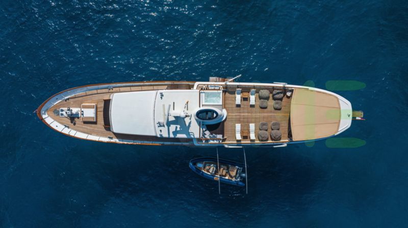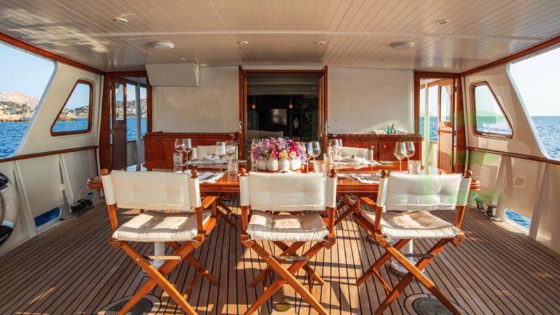 Enhanced by her steel full-displacement hull, and aluminium superstructure, a higher level of seaworthiness and comfort for those on board the SANTA MARIA yacht for sale has been achieved. The visual appeal of the exterior is complimented by the rich color and distinctive grain patterns of decks that lend an air of sophistication to the yacht's appearance.