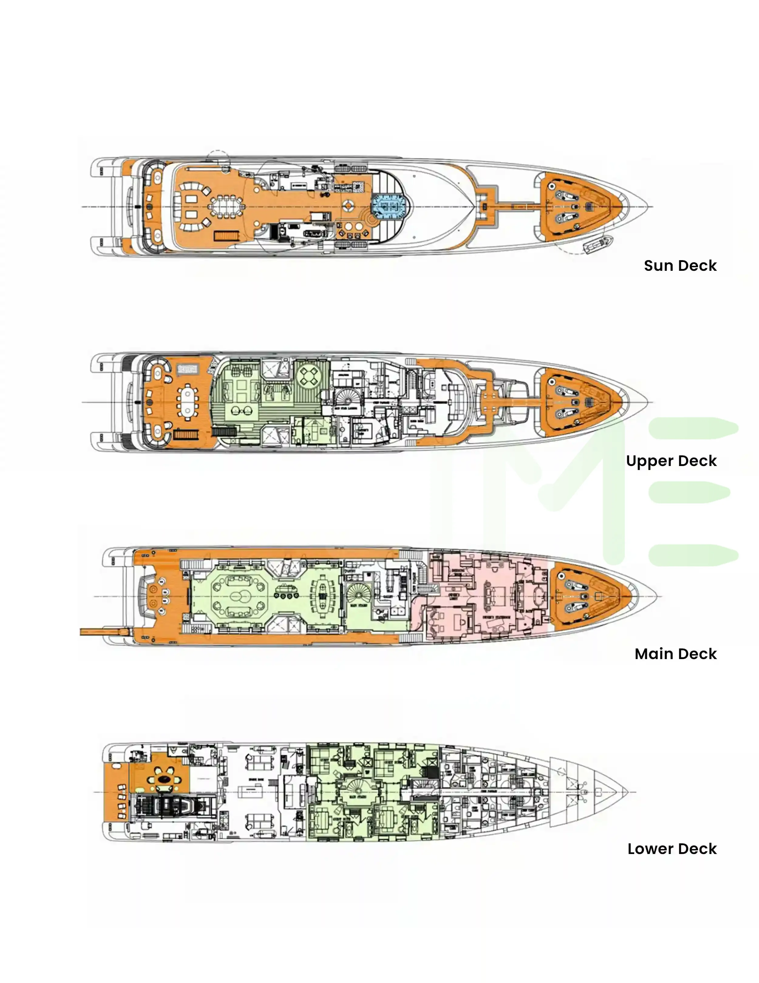 Request plans that include the layout of staterooms, guest areas, and outdoor spaces, as well as crew quarters and work areas.