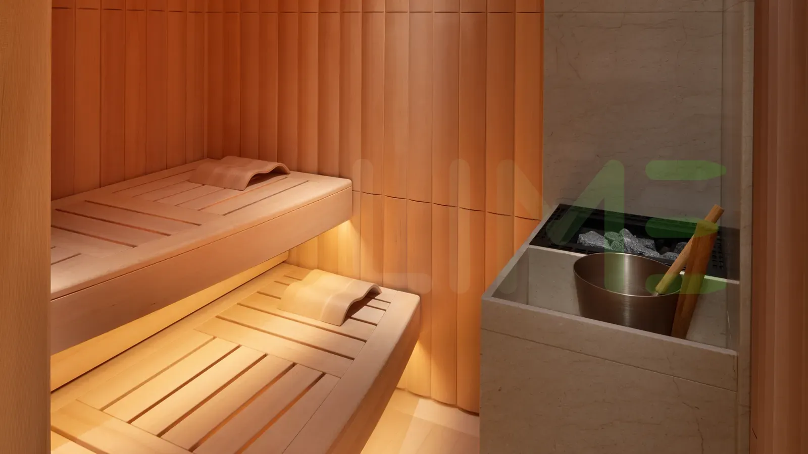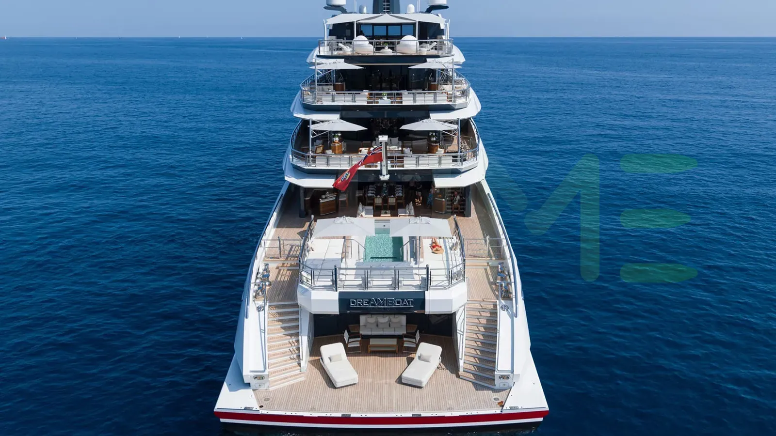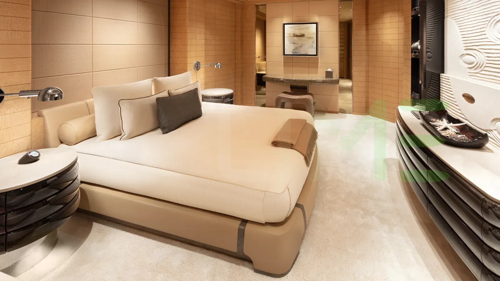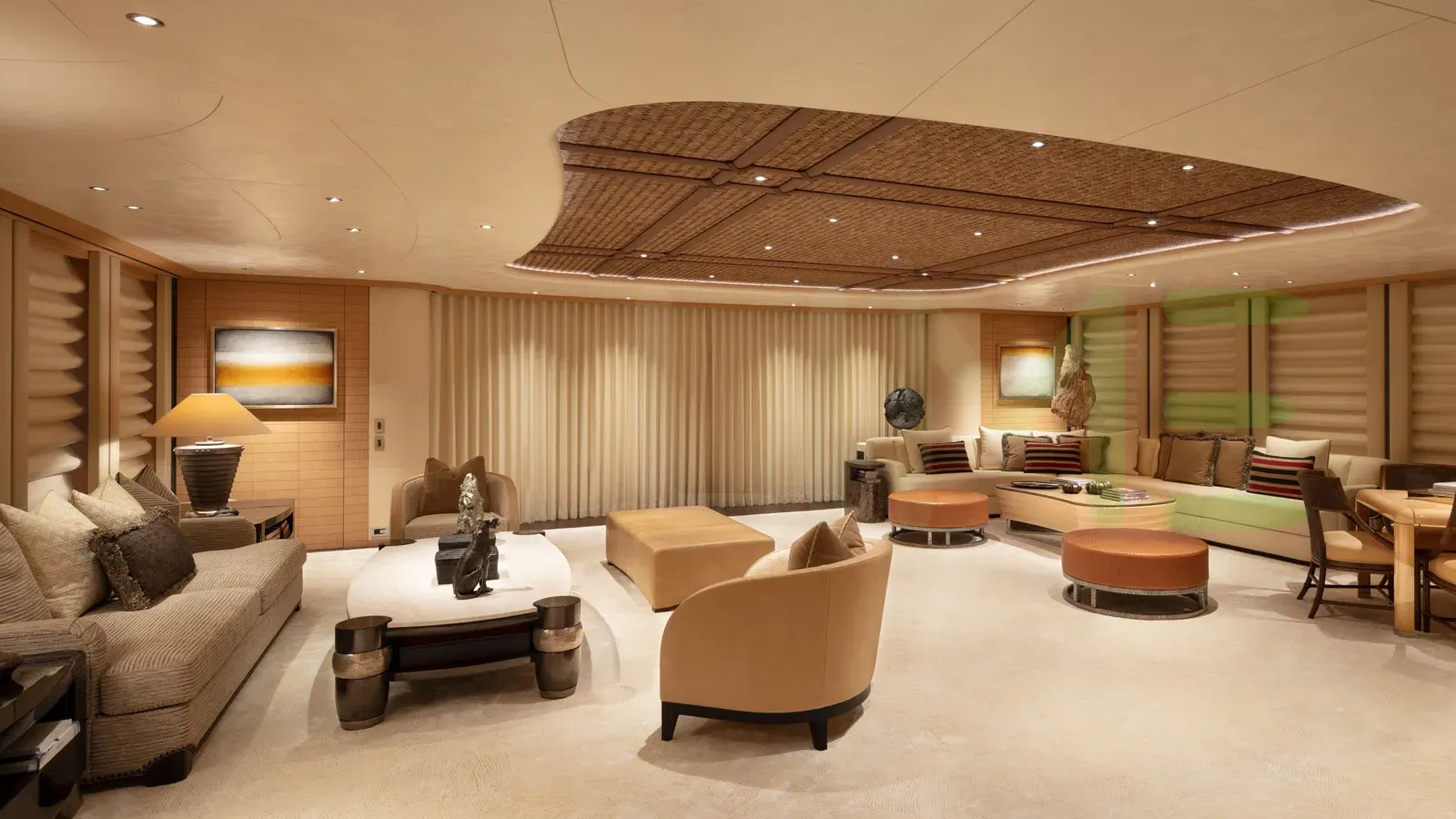 Her features include separate crew passageway, spa, beauty salon, elevator, underwater lights, beach club, gym and air conditioning.