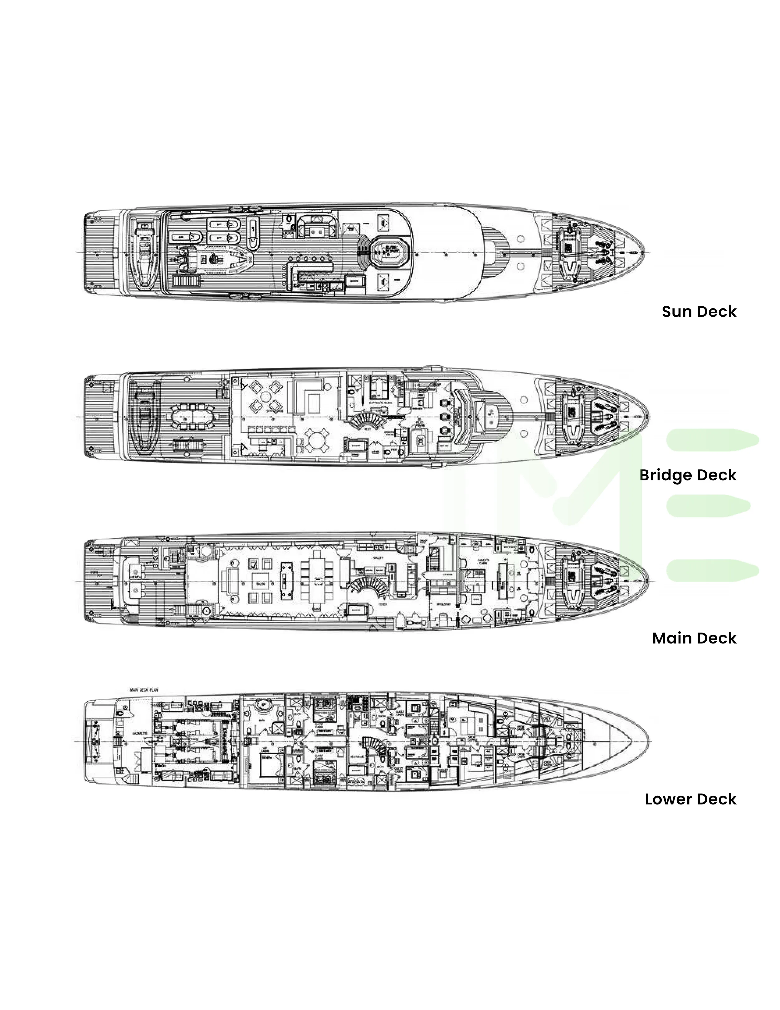 Request plans that include the layout of staterooms, guest areas, and outdoor spaces, as well as crew quarters and work areas.