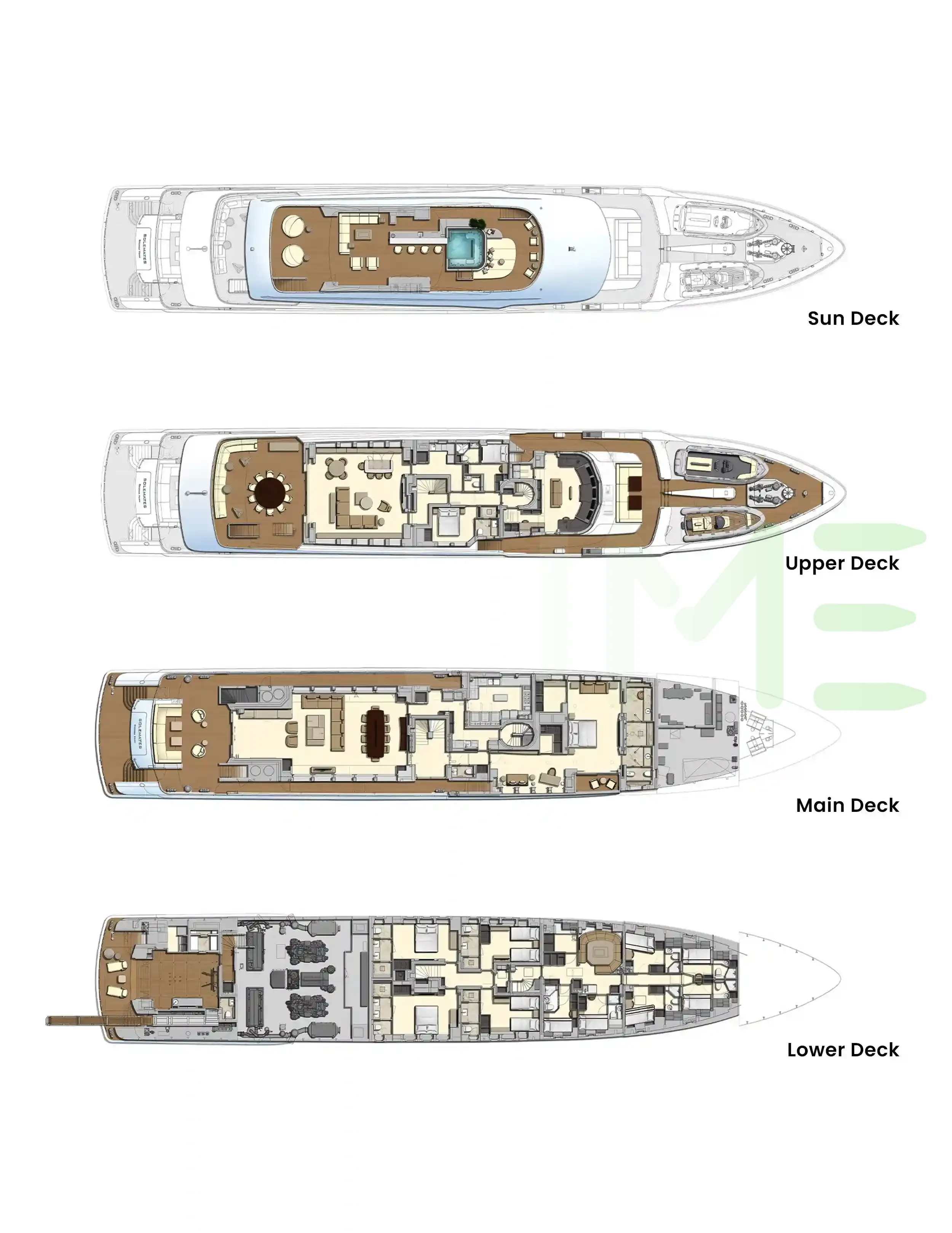 Request plans that include the layout of staterooms, guest areas, and outdoor spaces, as well as crew quarters and work areas.