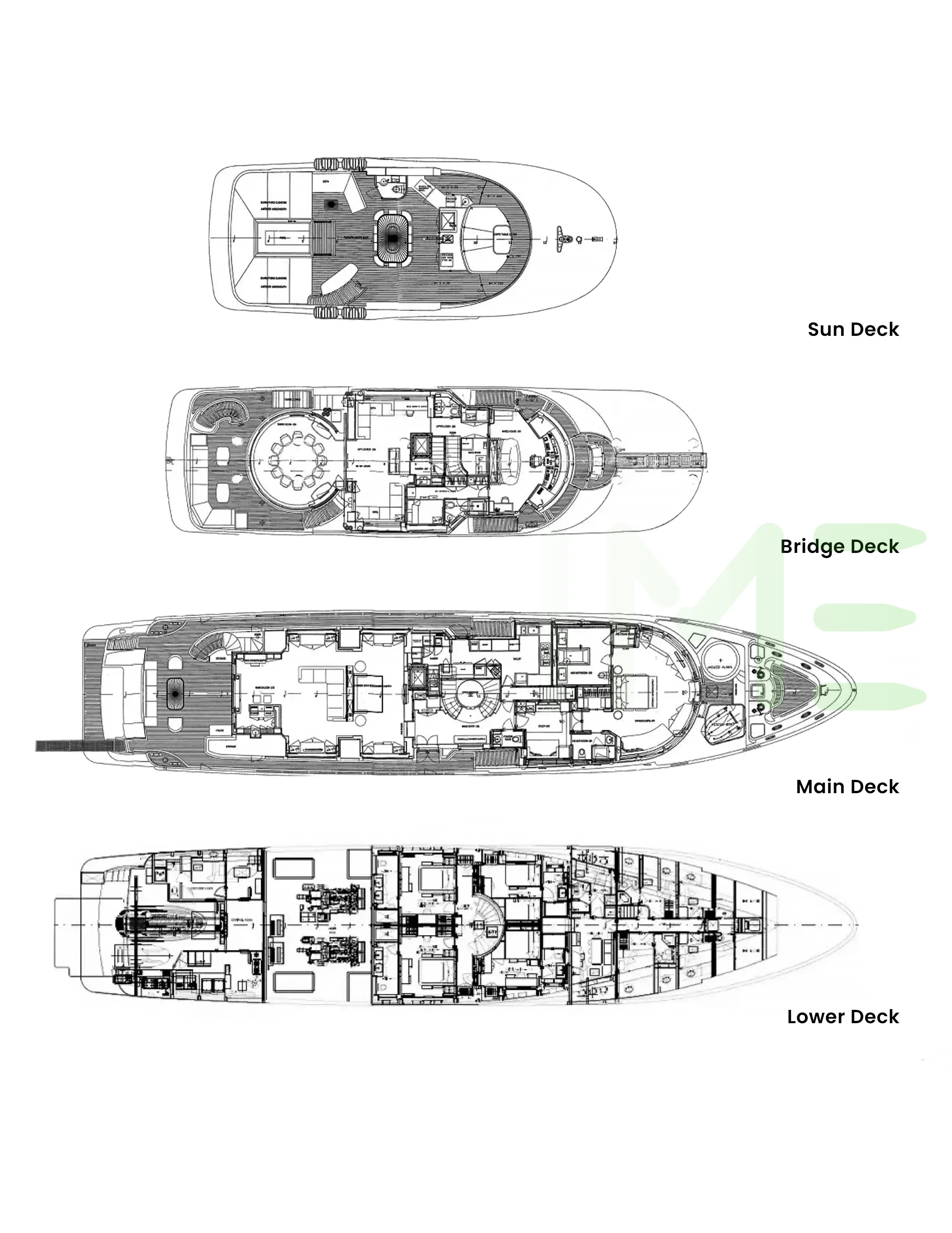 Request plans that include the layout of staterooms, guest areas, and outdoor spaces, as well as crew quarters and work areas.