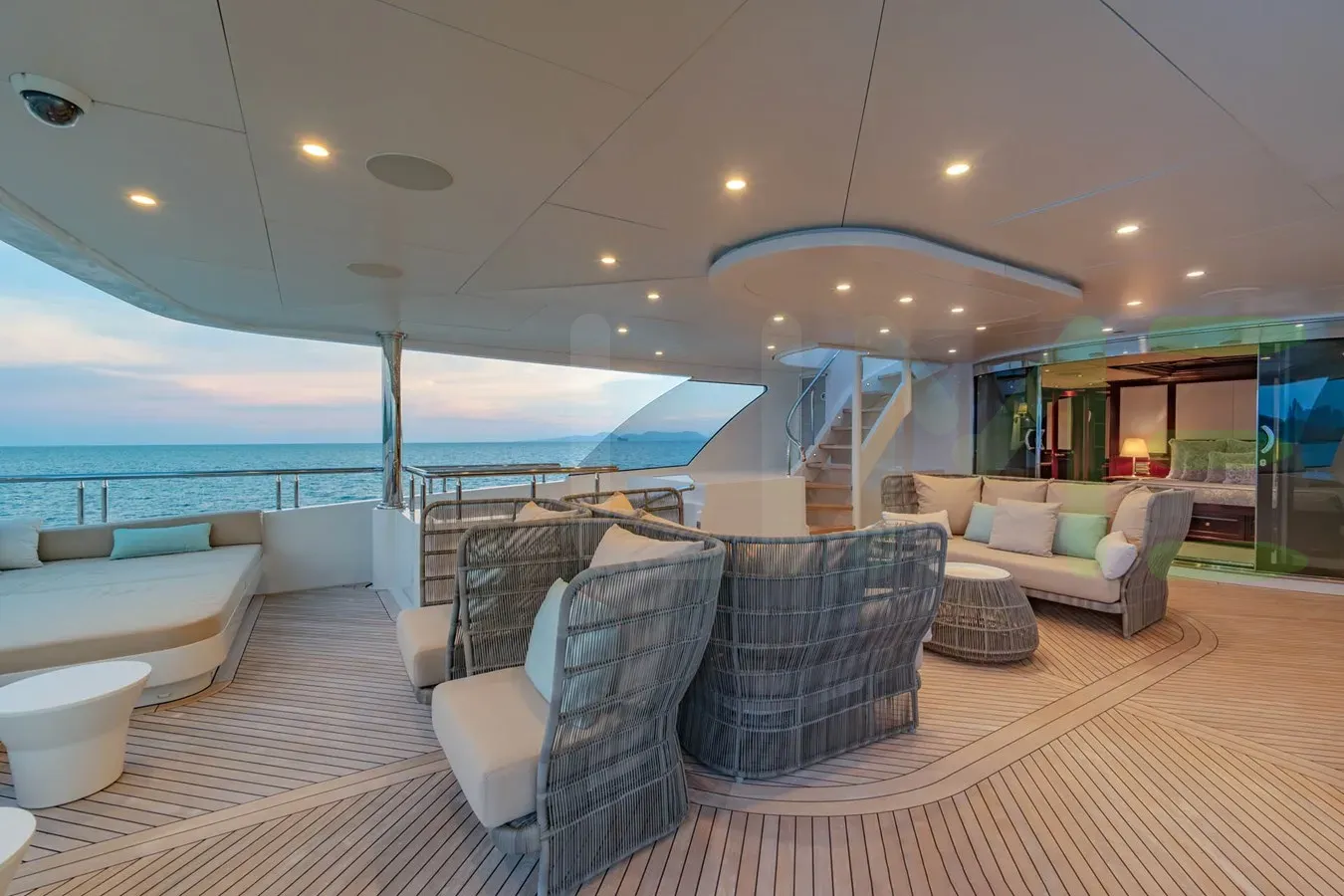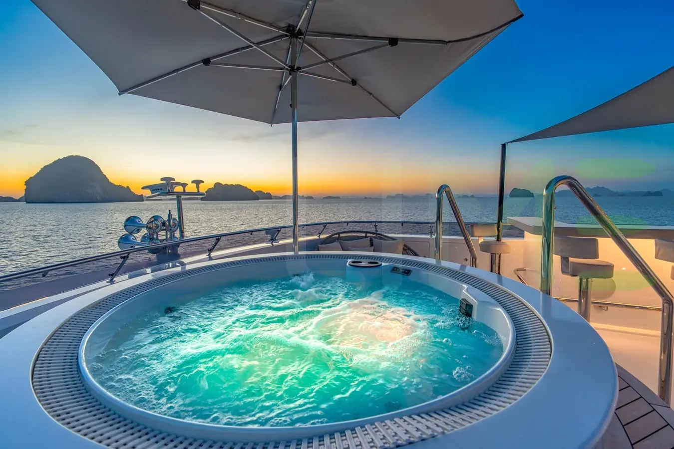 Her features include underwater lights, gym, deck jacuzzi, WiFi and air conditioning.