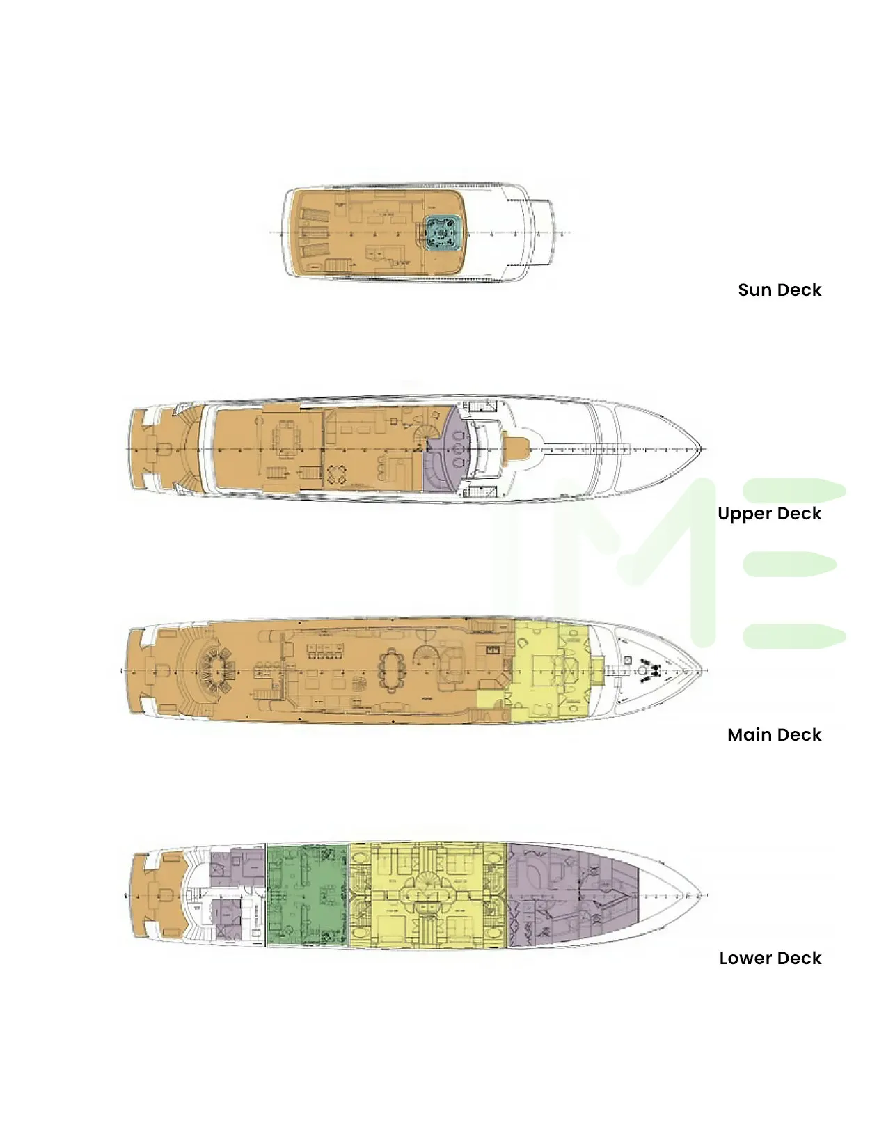 Request plans that include the layout of staterooms, guest areas, and outdoor spaces, as well as crew quarters and work areas.