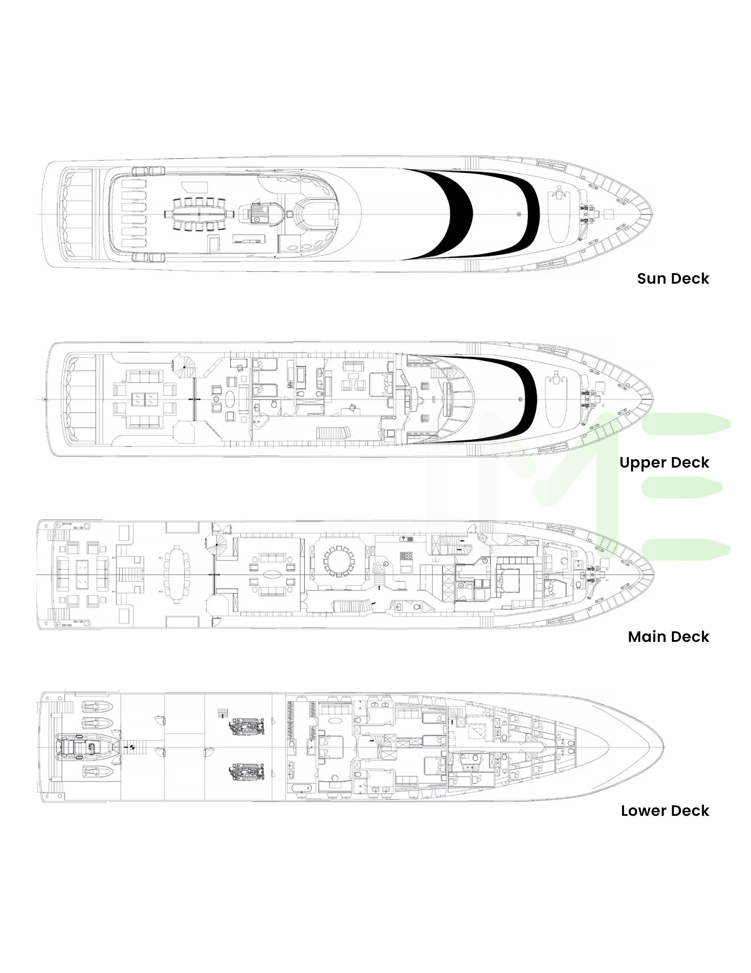 Request plans that include the layout of staterooms, guest areas, and outdoor spaces, as well as crew quarters and work areas.