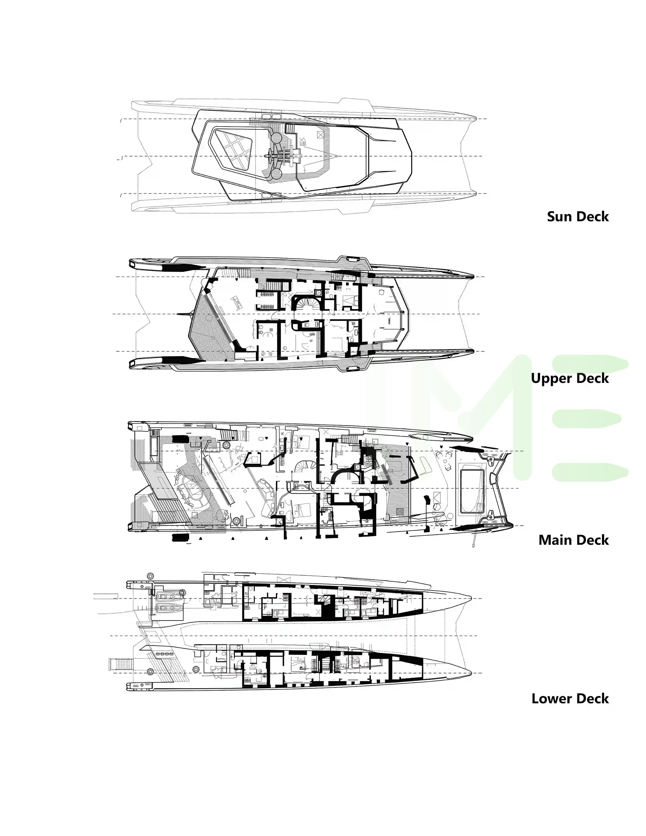 Request plans that include the layout of staterooms, guest areas, and outdoor spaces, as well as crew quarters and work areas.