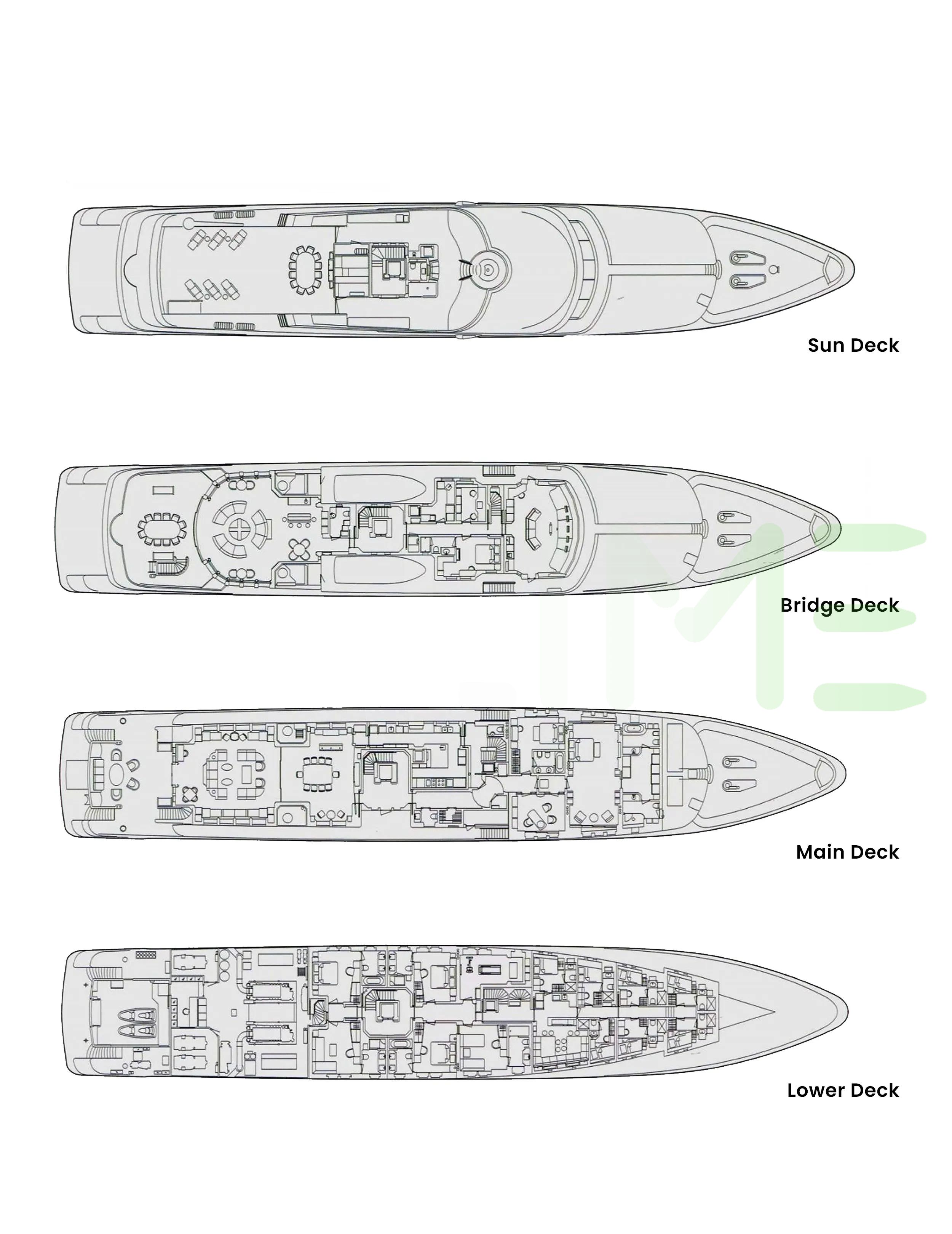 Request plans that include the layout of staterooms, guest areas, and outdoor spaces, as well as crew quarters and work areas.