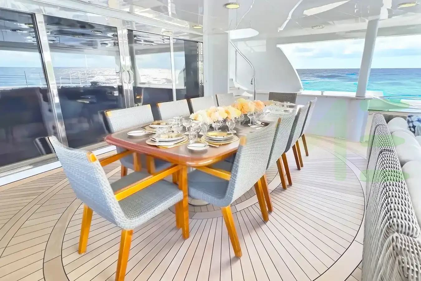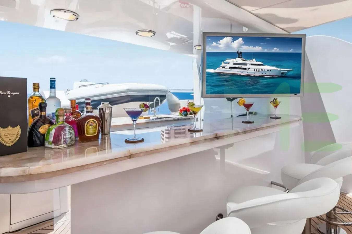On deck, guests can unwind in the jacuzzi, enjoy a cocktail at the sundeck or upper lounge bar, or stay active in the gym. The yacht is fully equipped with WiFi and air conditioning throughout. For those who seek adventure on the water, TRUE LOVE’s toy selection is exceptional, including: 5.79m / 19’ Nautica Tender, Jet skis. Seabobs, Waterskiing, Wakeboarding gear, Inflatable beach club, Water trampoline, Waterslide, Airfoils, Snorkeling equipment. To complete the experience, guests can enjoy onboard massage treatments, creating the perfect balance of relaxation and recreation. Whether cruising secluded coves or entertaining on deck, TRUE LOVE delivers the ultimate superyacht lifestyle.