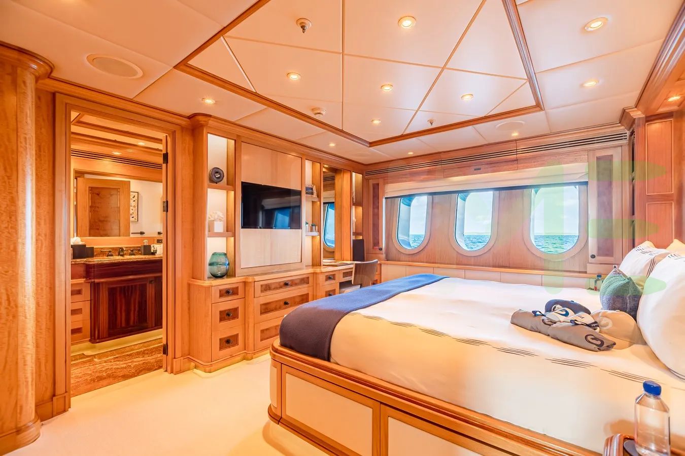 UNBRIDLED is a full-displacement oceangoing mono-hull motoryacht, with a beam of 35' (10.67 meters), offering stability and comfort during blue water open ocean navigation, including near coastal and inland cruising. Her full-displacement hull shape and draft of 10' (3.05 meters) further contribute to a yacht with a longer range, stowage, and a smooth sailing experience, making her ideal for extended journeys and global travel.