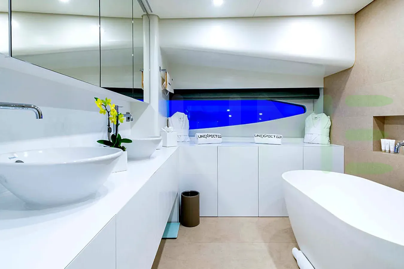 Up to 8 guests can be accommodated on board the yacht UNEXPECTED in 5 staterooms. UNEXPECTED also includes accommodations for 7 crew members, including the yacht’s captain. Whether you envision private escapes or unforgettable voyages, you're invited to discover a world where elegance meets adventure.