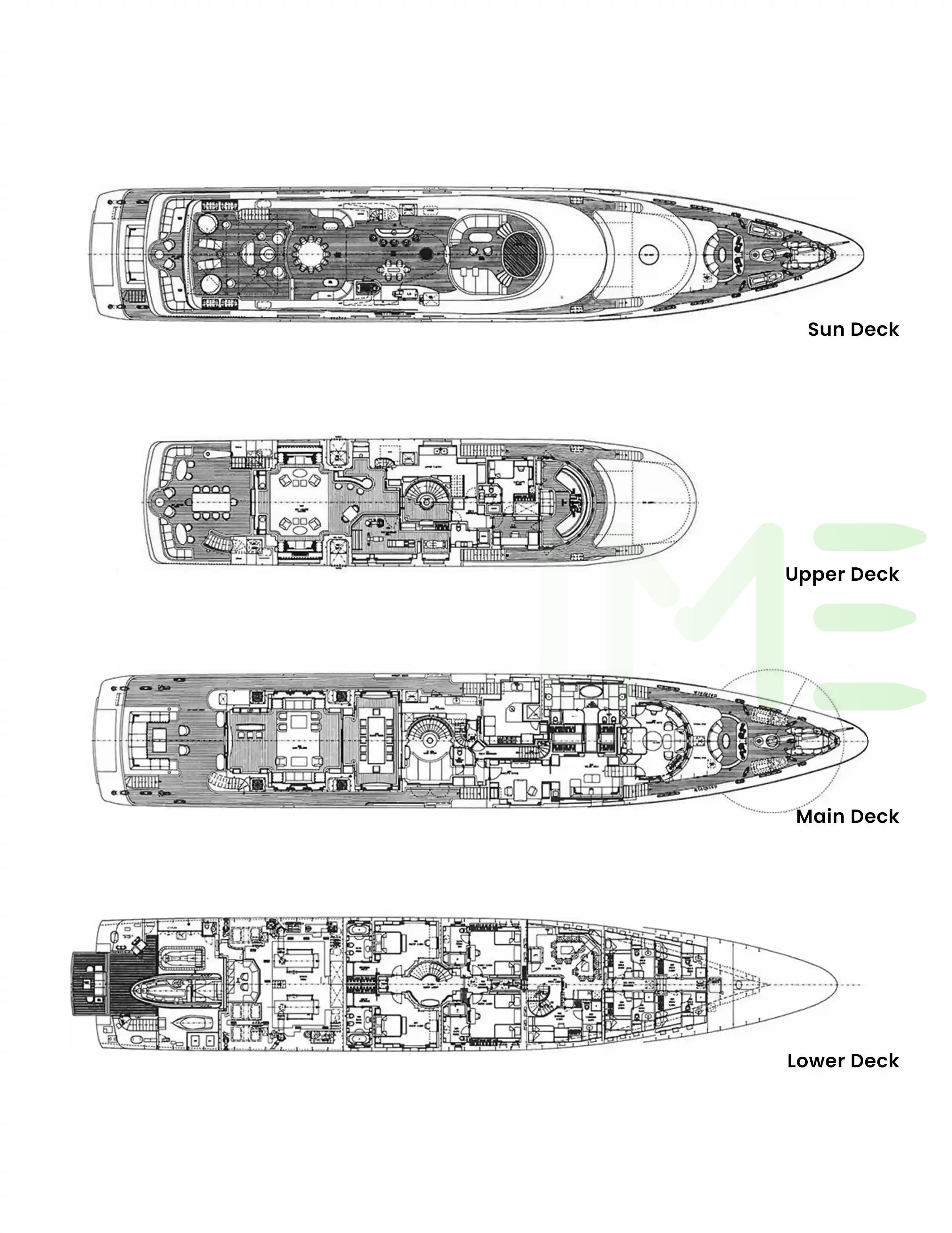 Request plans that include the layout of staterooms, guest areas, and outdoor spaces, as well as crew quarters and work areas.