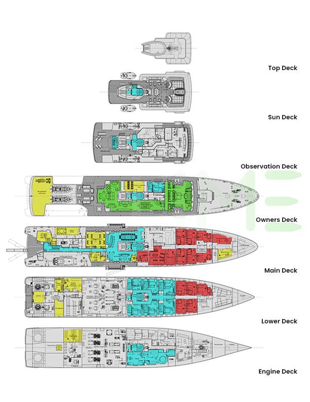 Request plans that include the layout of staterooms, guest areas, and outdoor spaces, as well as crew quarters and work areas.
