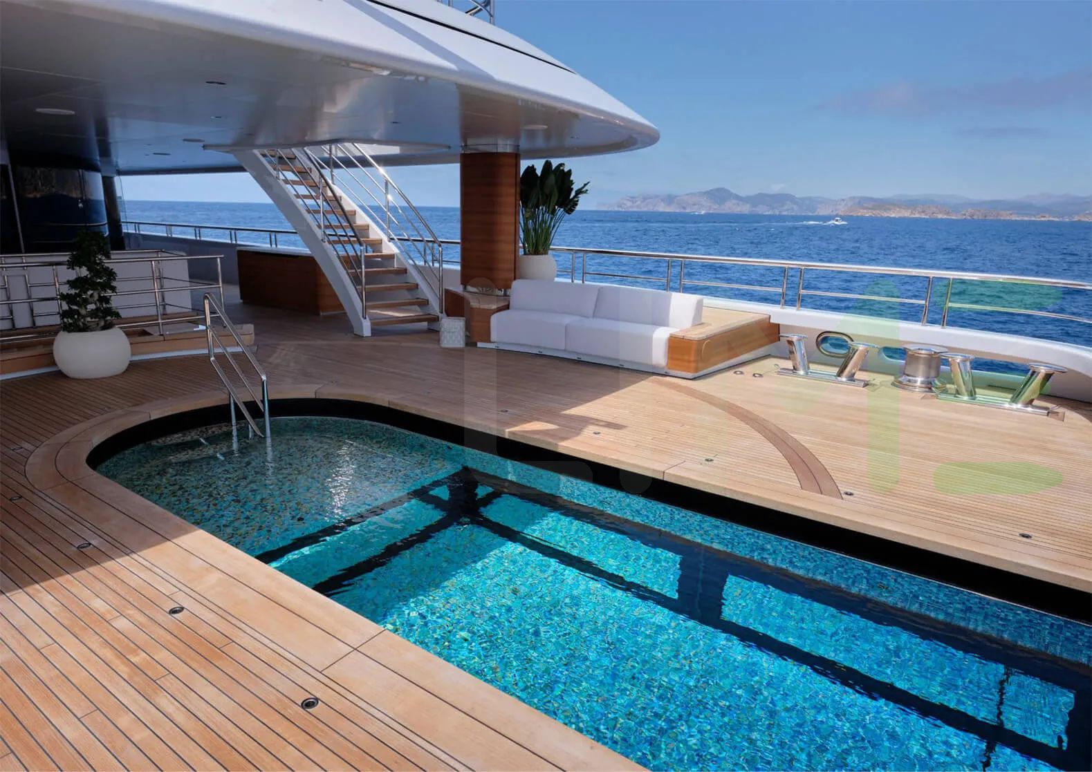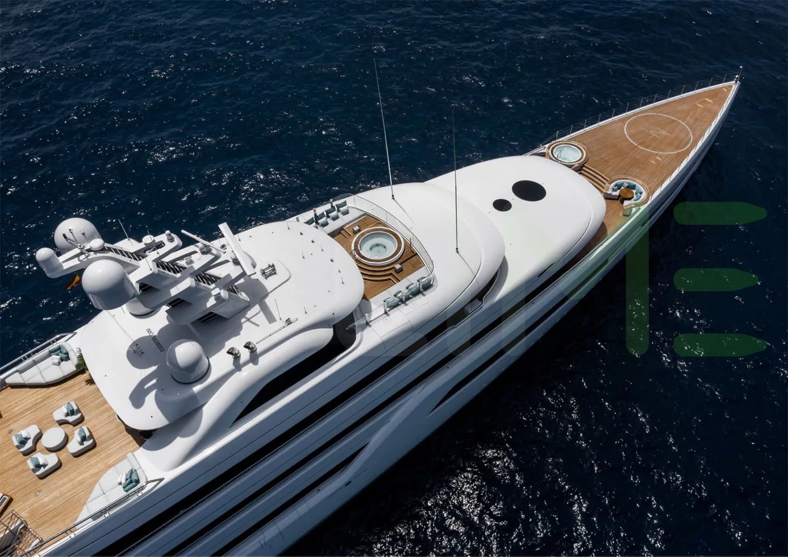 Her features include a spa, sauna, elevator, beach club, deck jacuzzi, WiFi and air conditioning.