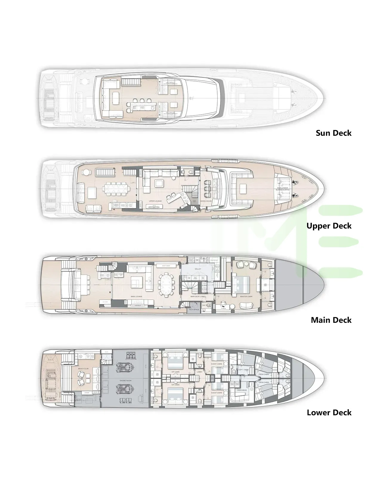 Request plans that include the layout of staterooms, guest areas, and outdoor spaces, as well as crew quarters and work areas.