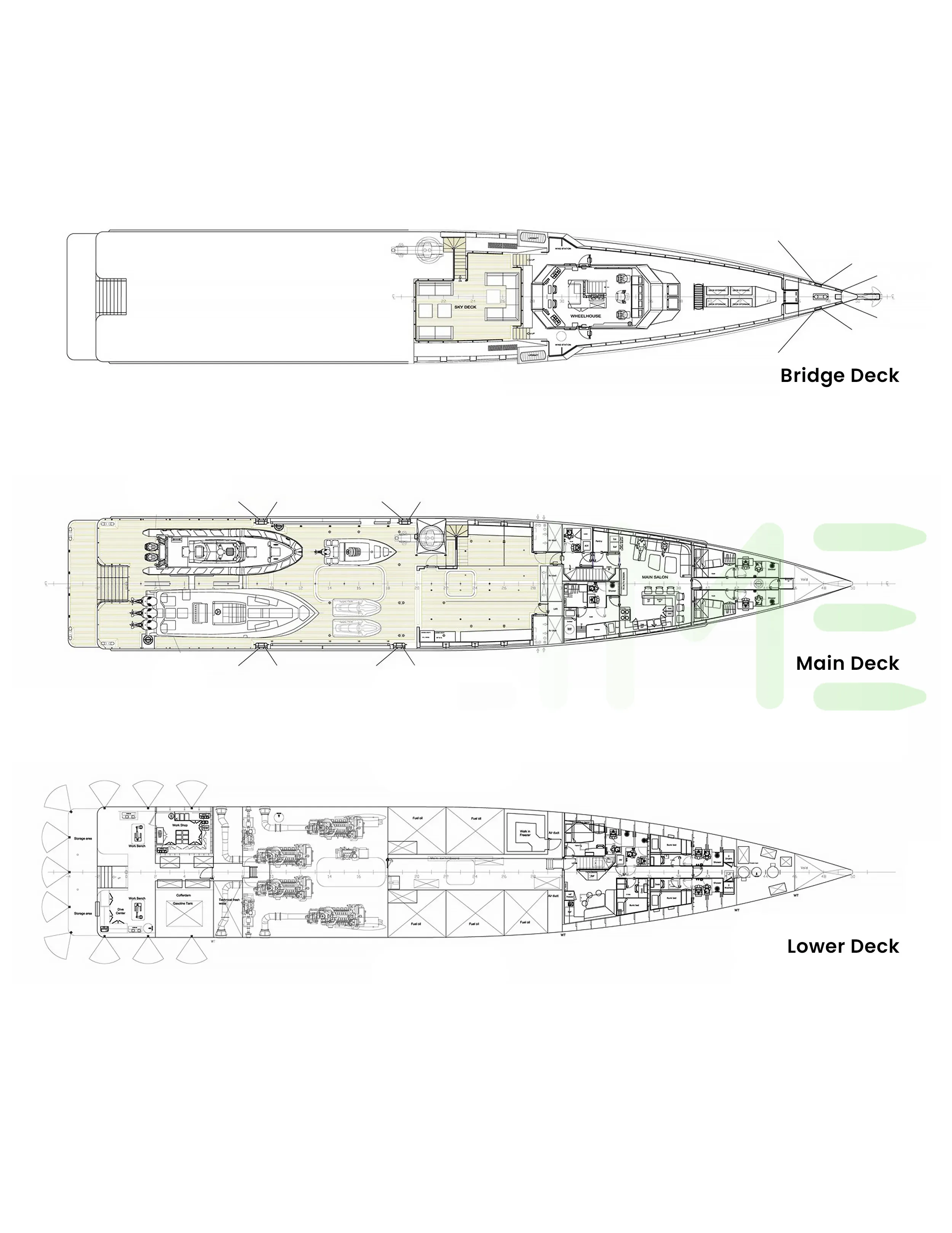 Request plans that include the layout of staterooms, guest areas, and outdoor spaces, as well as crew quarters and work areas.