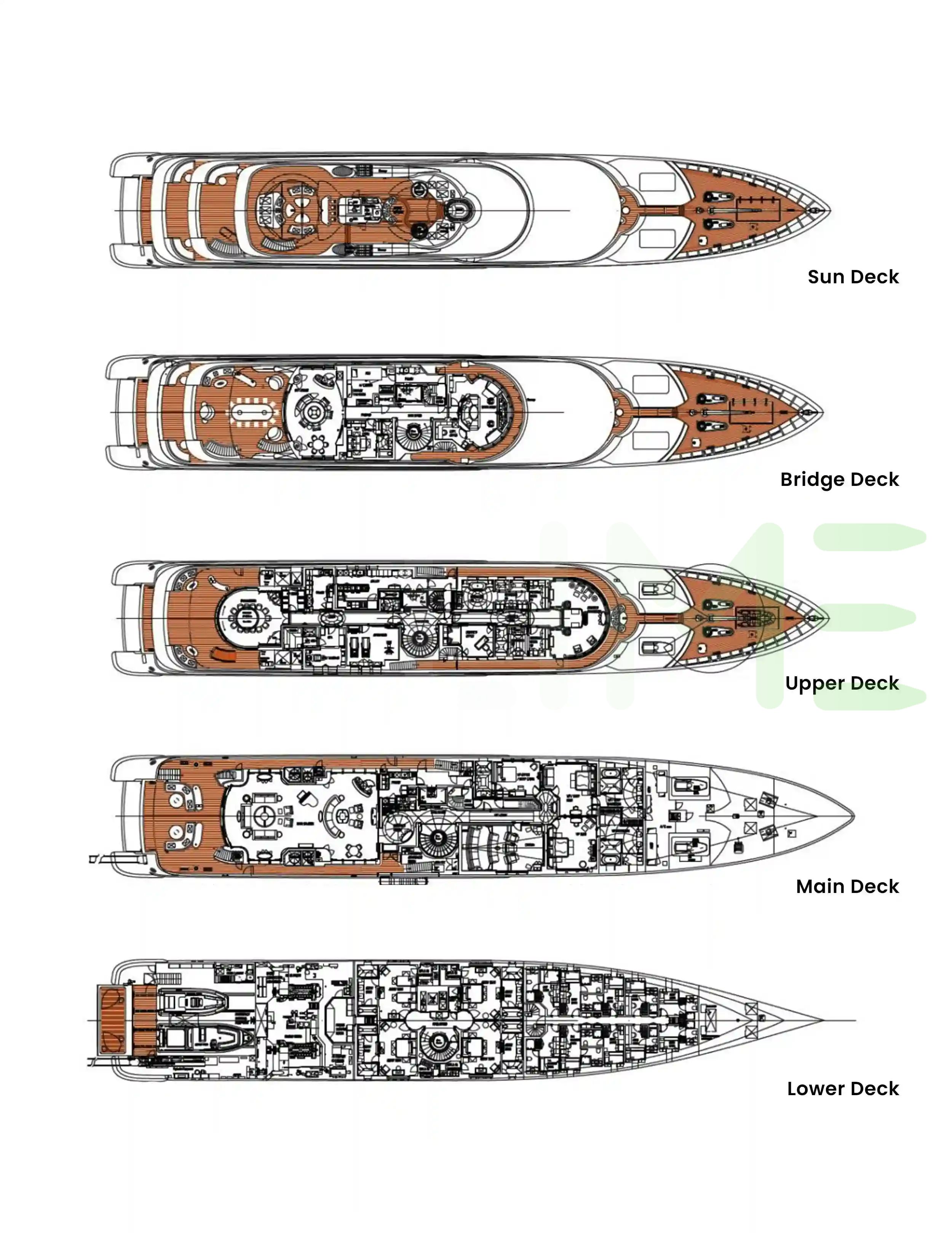 Request plans that include the layout of staterooms, guest areas, and outdoor spaces, as well as crew quarters and work areas.
