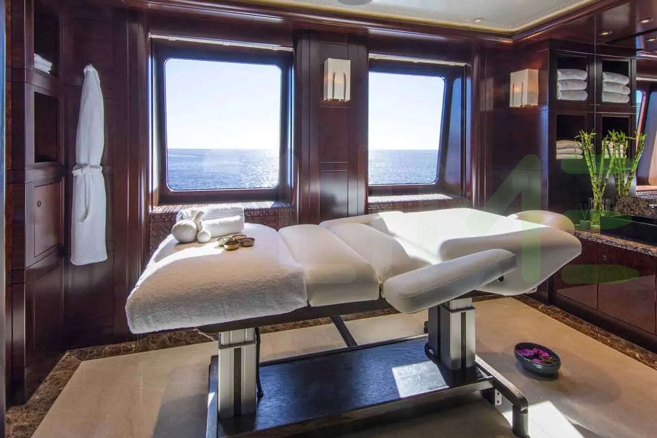 Her features include a movie theatre, beauty salon, elevator, underwater lights, gym and air conditioning.