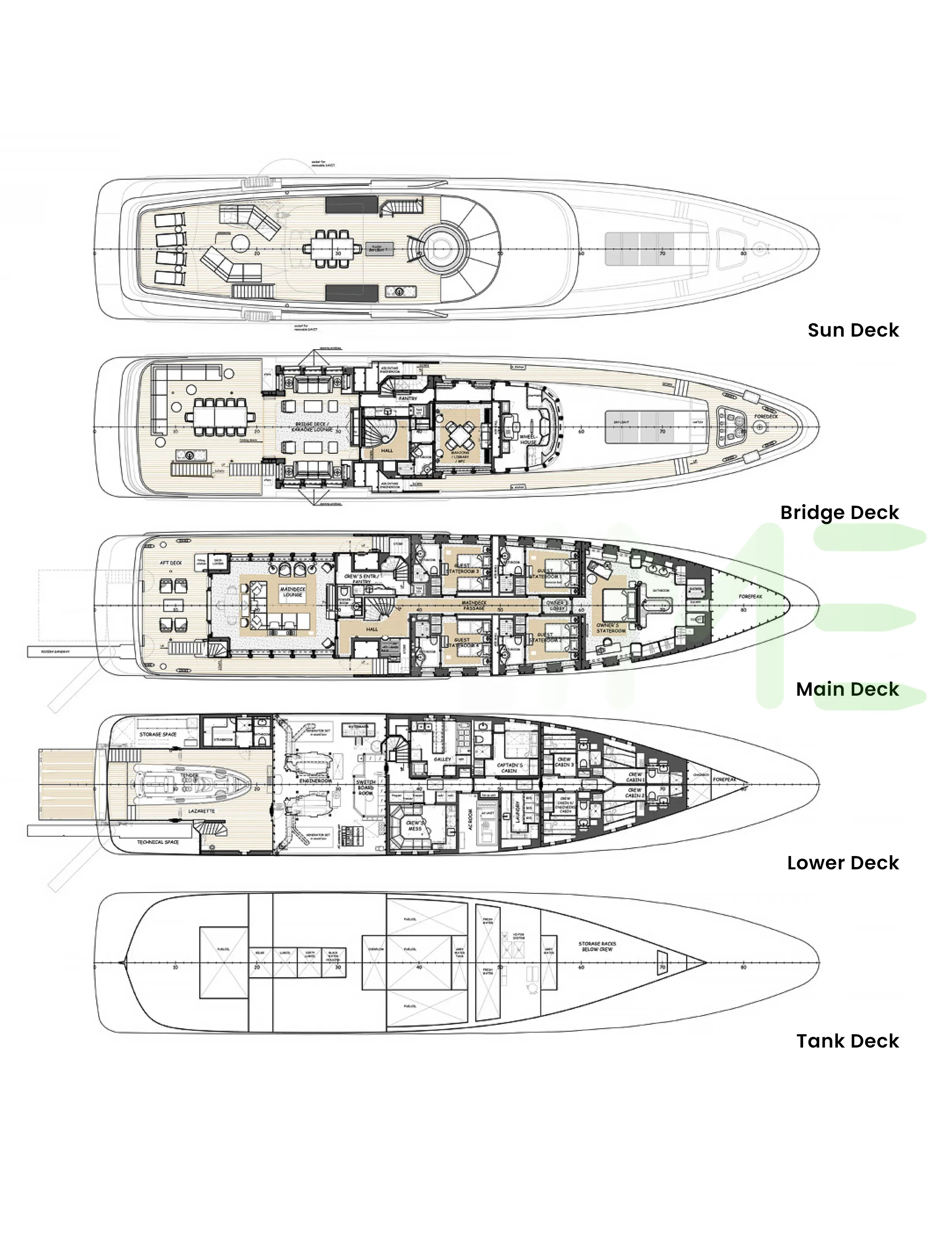Request plans that include the layout of staterooms, guest areas, and outdoor spaces, as well as crew quarters and work areas.