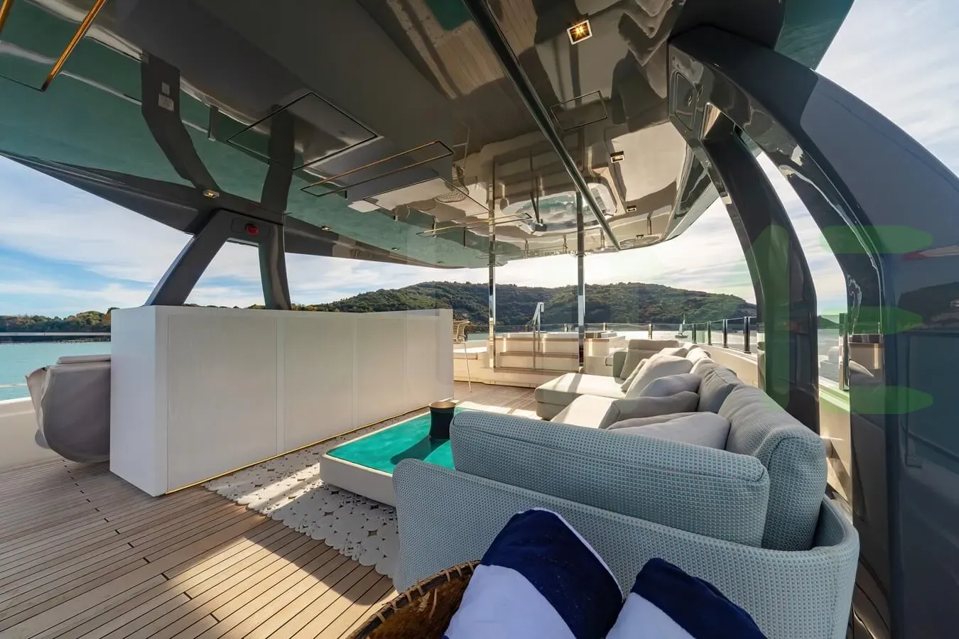Her features include underwater lights, deck jacuzzi, WiFi and air conditioning.