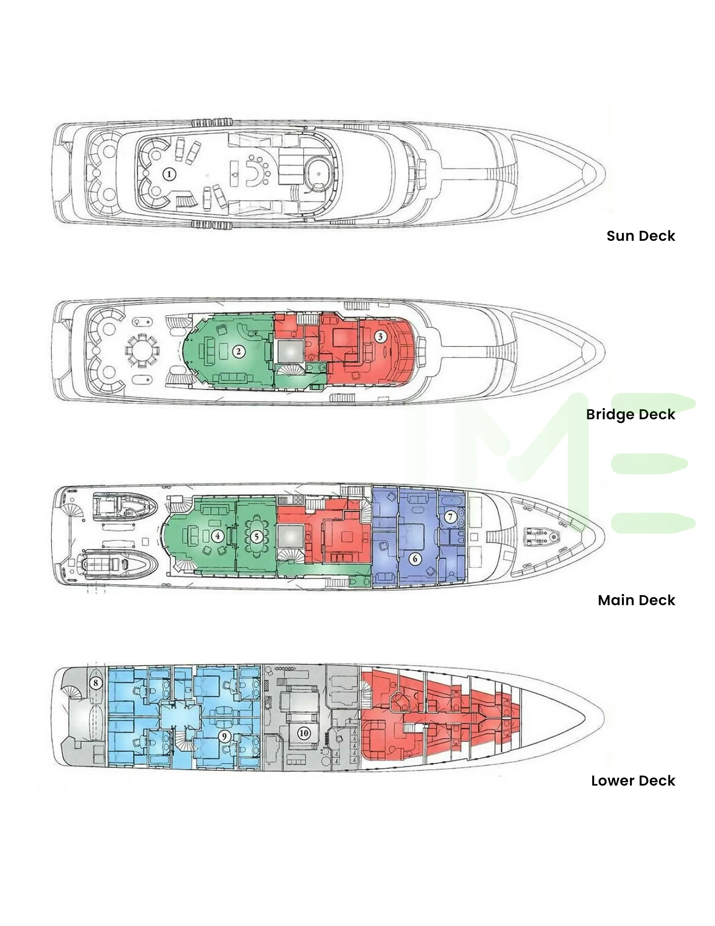 Request plans that include the layout of staterooms, guest areas, and outdoor spaces, as well as crew quarters and work areas.