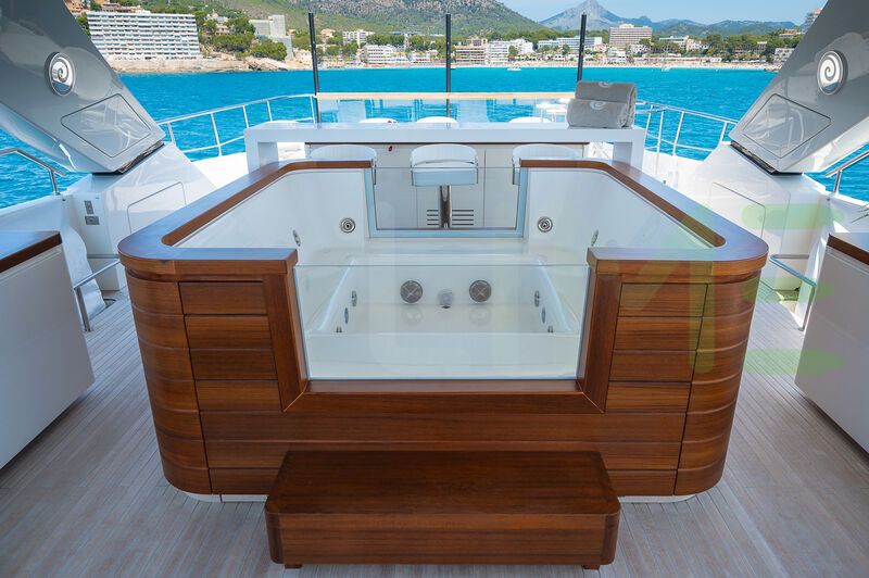 Her features include underwater lights, deck jacuzzi, WiFi and air conditioning.