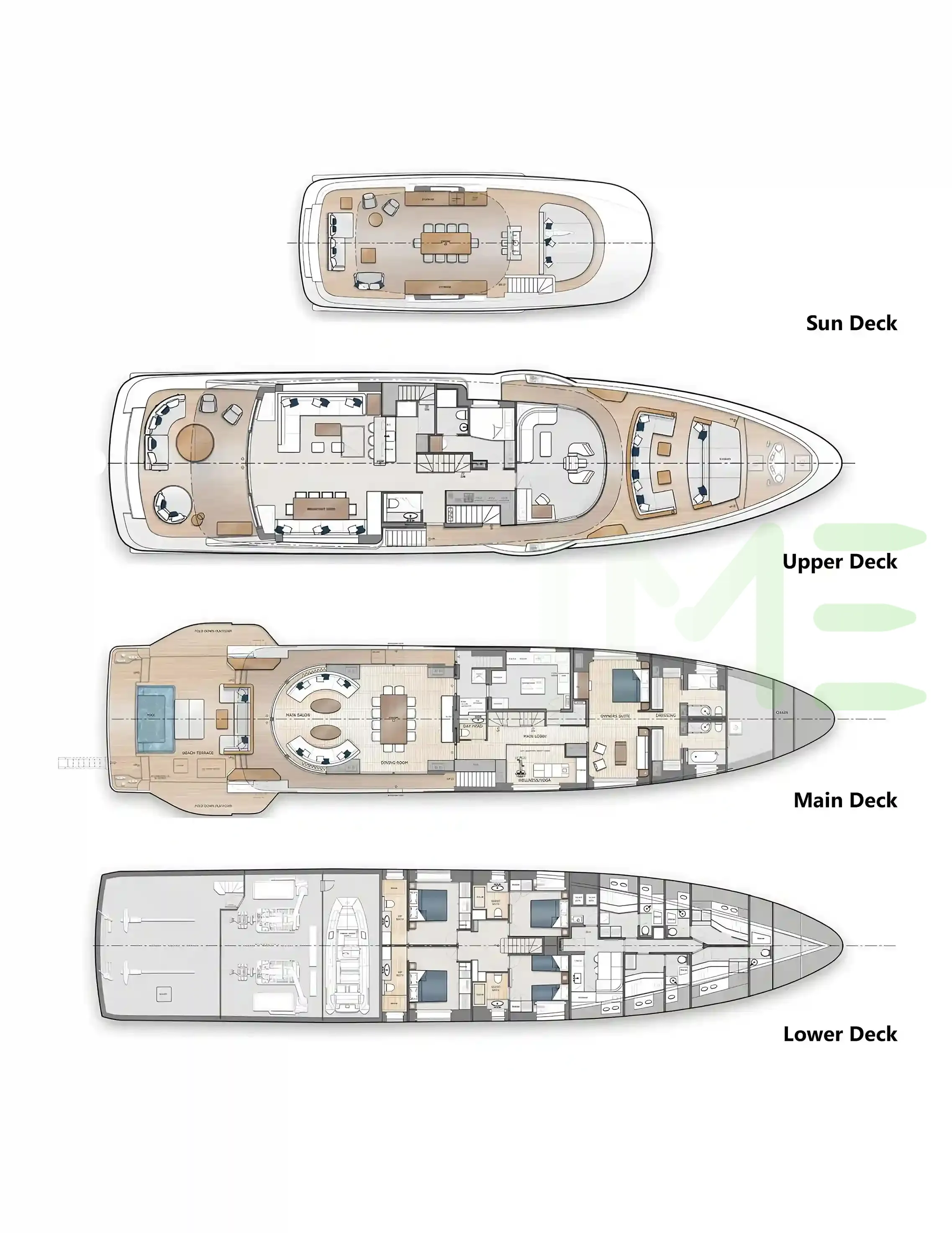 Request plans that include the layout of staterooms, guest areas, and outdoor spaces, as well as crew quarters and work areas.