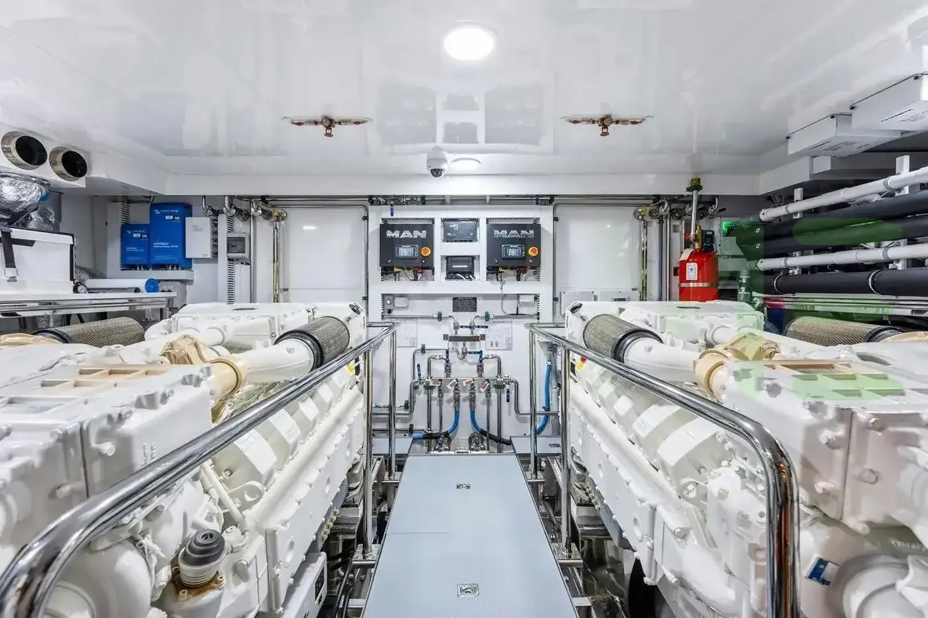 Powered by two MAN main engines, each generating 1,417 horsepower, for a total combined output of 2,834 horsepower. Notably, the LIVING LIFE yacht is one of 1,056 yachts greater than 65’(19m) with MAN engines.