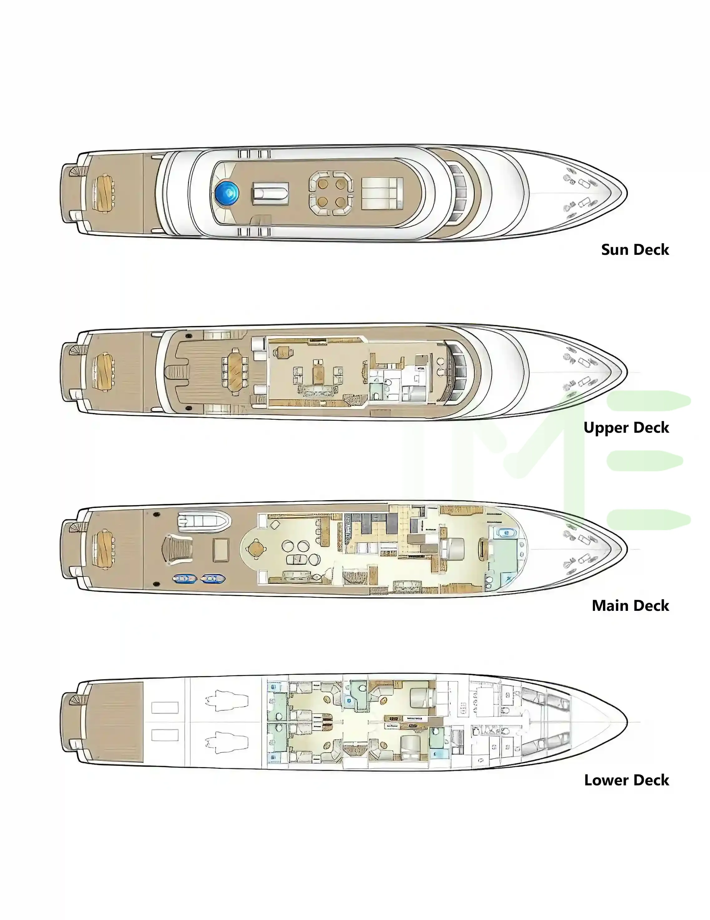Request plans that include the layout of staterooms, guest areas, and outdoor spaces, as well as crew quarters and work areas.