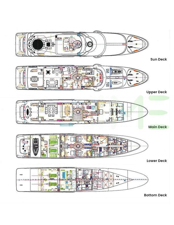 Request plans that include the layout of staterooms, guest areas, and outdoor spaces, as well as crew quarters and work areas.