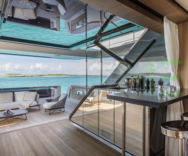 The styling of the NEVER BLUE yacht features exterior design by Francesco Paszkowski and interior design by Francesco Paszkowski. Up to 10 guests can be accommodated on board the superyacht NEVER BLUE in 5 staterooms. NEVER BLUE also has accommodations for 6 crew members, including the yacht’s captain.