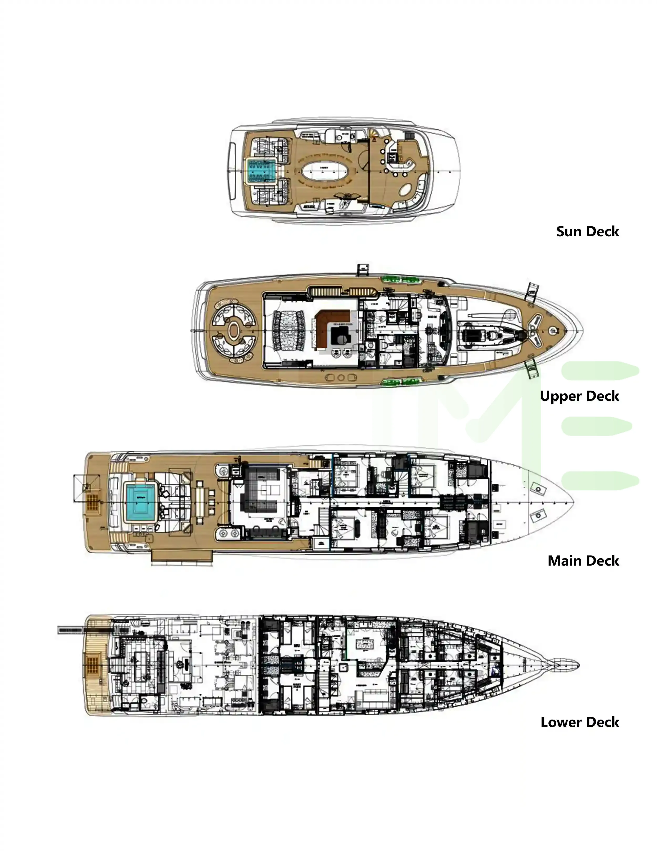 Request plans that include the layout of staterooms, guest areas, and outdoor spaces, as well as crew quarters and work areas.