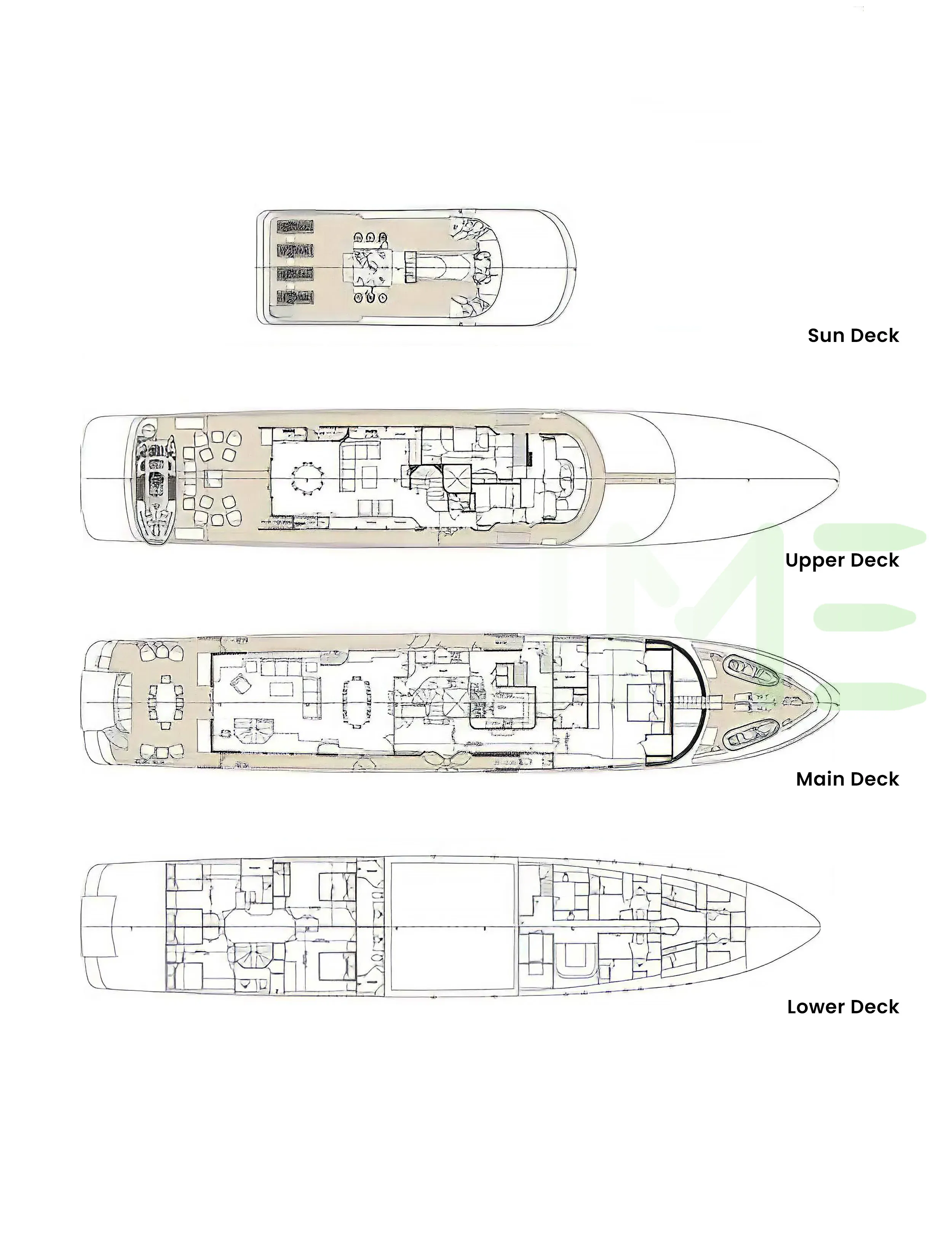 Request plans that include the layout of staterooms, guest areas, and outdoor spaces, as well as crew quarters and work areas.